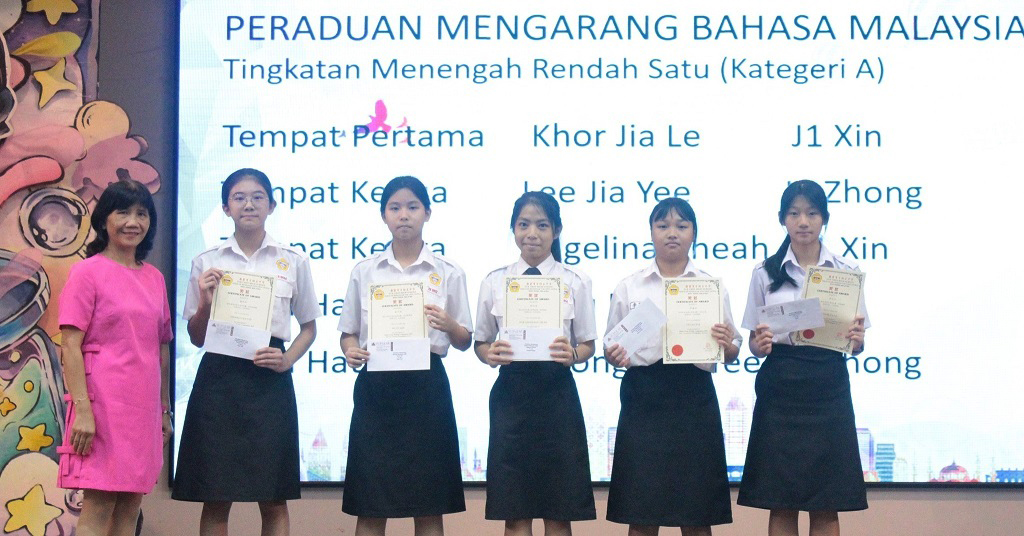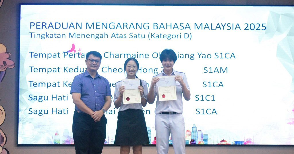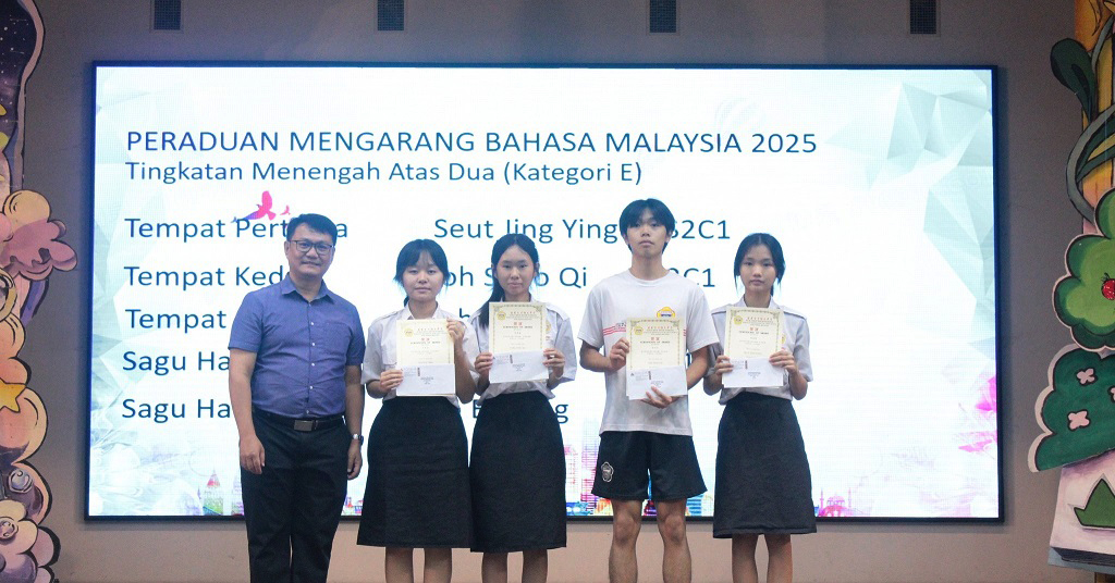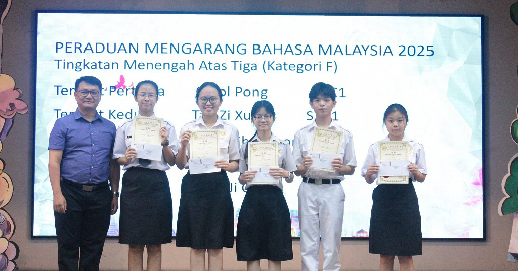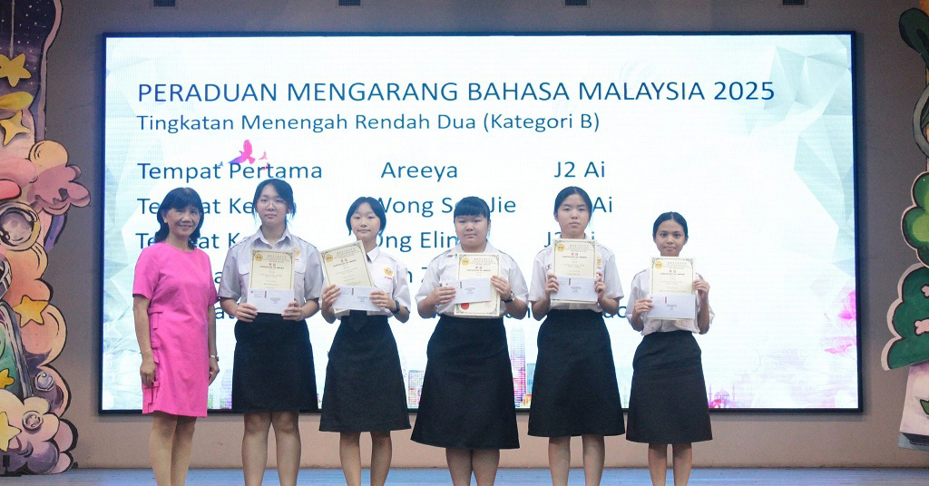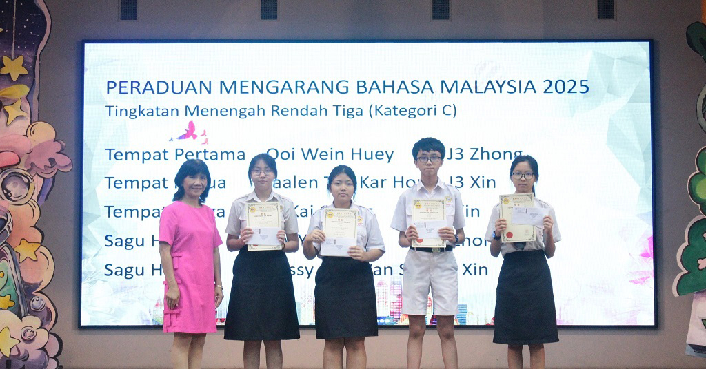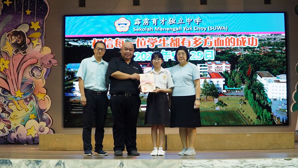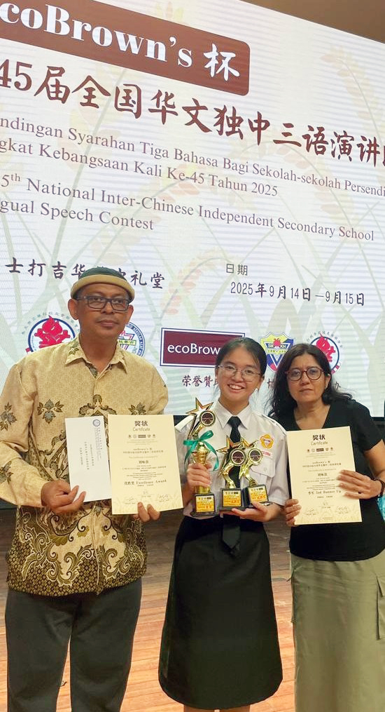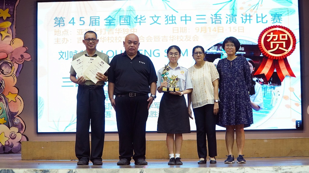 刘咏歆参加第45届全国华文独中三语演讲比赛 获得初中组华语季军、国语优胜奖、三语优胜奖 本校刘咏歆同学(初三信)在 Ms. Harjit 与 Cikgu Azlan 的带领下,于9月14至15日远赴亚罗士打吉华独中,参加“第45届全国华文独中三语演讲比赛”,并在激烈的角逐中载誉而归! 此次赛事汇聚全国华文独中演讲菁英,竞争异常激烈。刘同学凭借精湛的演说技巧与自信大方的舞台风采脱颖而出,勇夺佳绩! 华语即席演讲 —— 季 军 在此,谨向刘咏歆同学表示热烈的祝贺!她以实力与努力,为自己的人生写下了精彩的一笔,也为学校争光。同时,衷心感谢三位悉心指导的老师:纪瑞芬老师(华语即席演讲)、Ms. Harjit(英语演讲)及 Cikgu Azlan(国语演讲)。正是因为你们倾注心力、辛勤耕耘,才有今日的辉煌成果。 校长(左二)在周会上表扬刘咏歆同学。 本校表扬高一理班到育才华小进行科学实验展