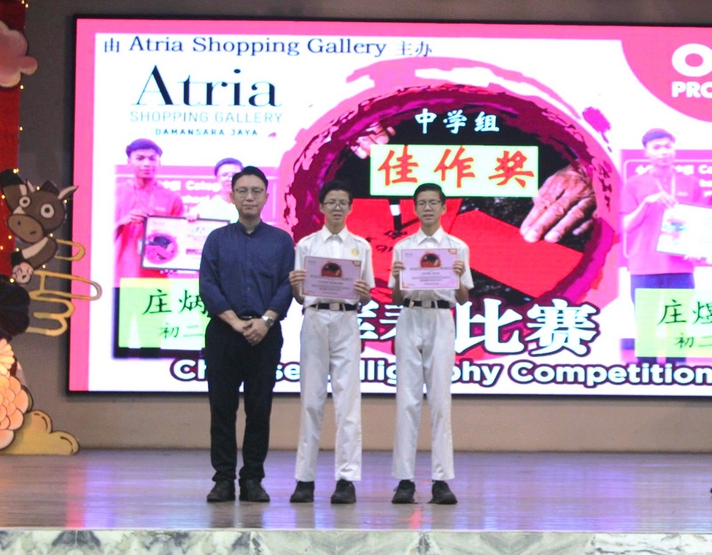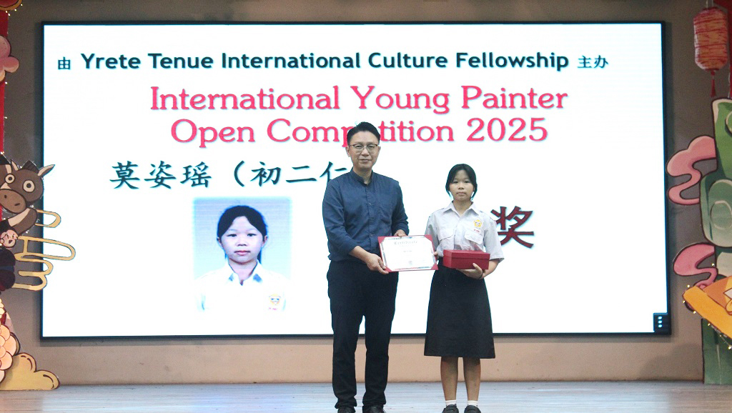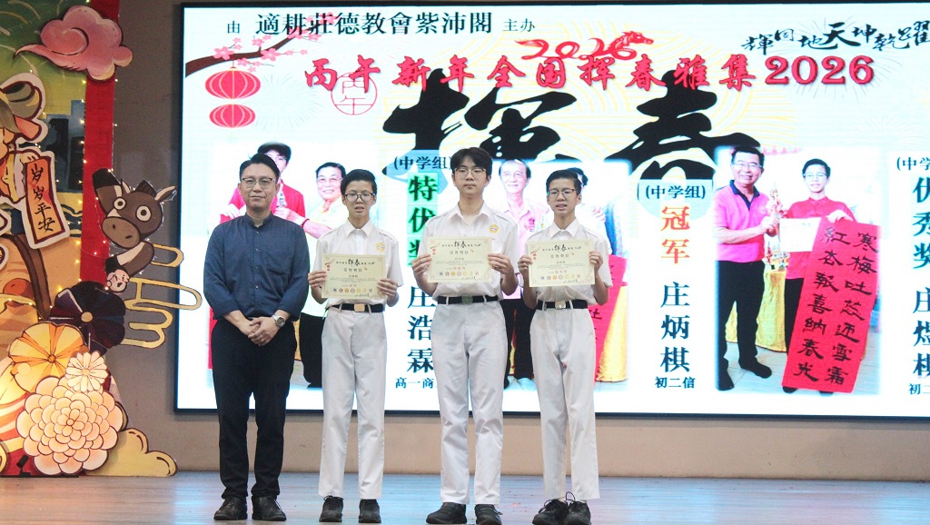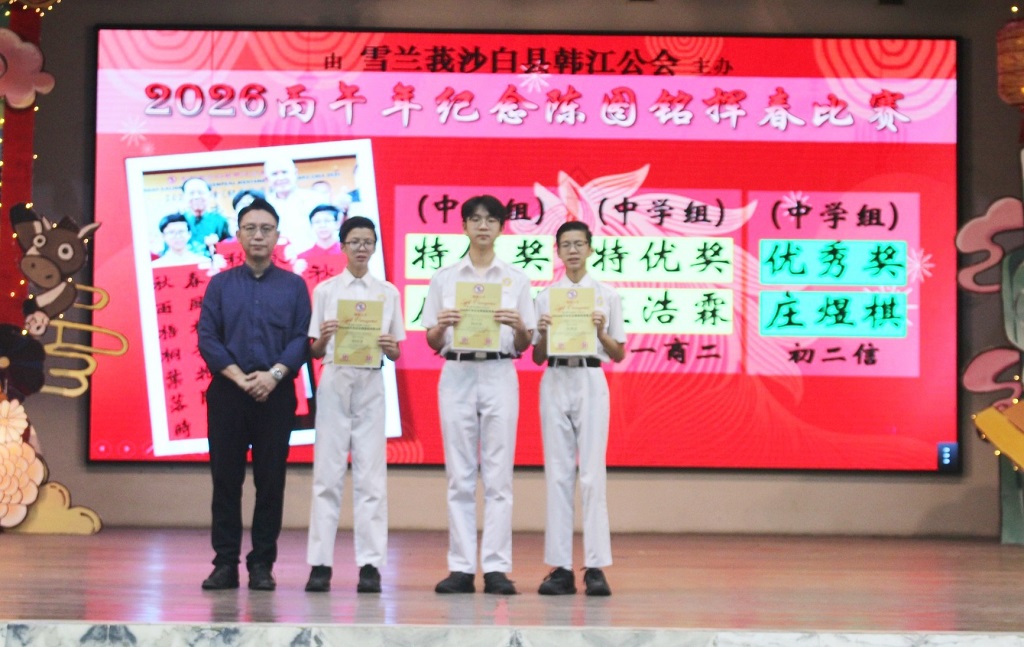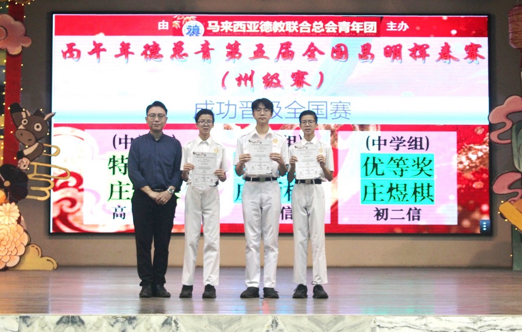 本校二十四节令鼓队 本校二十四节令鼓队于3月14日到槟城参加“2026年二十四节令鼓全国精英赛(北马区)”,并收获殿军。 舞台上的短短几分钟,背后是许多个傍晚的练习,是一次次反复调整的节奏,也是孩子们认真敲出的每一声鼓响。 这一次,他们把平日的努力带上舞台,把振奋人心的鼓声带给观众,也为自己留下了一段难忘的经历。 感谢每一位团员的坚持与付出,也感谢家长们在背后的默默支持,让孩子们得以在舞台上尽情绽放。 同时感谢锺建博教练与卢湋善助教的悉心指导,以及此次全程带队陪伴的幸齐能老师、刘玮芊老师、吕紫莹老师和刘俊庭老师。 鼓声暂时落下,但属于他们的成长仍在继续。期望二十四节令鼓队再创高峰,团员们也继续在中学生涯里,敲出属于自己的精彩篇章。 得奖学生: 张正轩、吴予琦(初二信)、黄纬源、张文浩(初三孝)、江易轩、彭愉恩、罗紫晴、苏紫晴、依莎贝拉(初三仁)、 刘襄、闫辛钰、侯仪涵、曾庆晏(高一理)、许熒恩、黄俊希、邱煜晴(高一商一)、彭靖涵(高一文)、 黄紫琳、李珈宣(高一文美)、陈俊宇(高一汽修)、宋启阳(高二理)、丘浩熙(高二商二)、 杨迦喆(高二文)、陈家乐(高二文美)、邹宇轩(高三理)、马韵婷(高三文) 摄影:由学生家长提供 校方在周会上表扬得奖学生。 摄影:张仁杰(初三忠)、廖子健(高一文美) 第二届儿童青少年武术套路公开赛:传统太极短兵器套路 金奖、传统太极拳套路 银奖