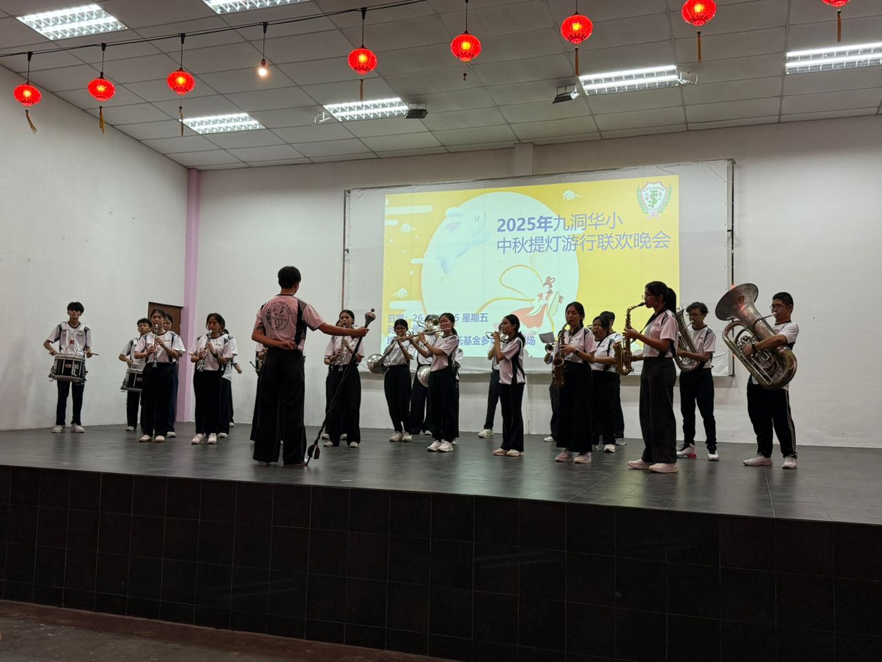 本校龙狮团与管乐团 2025年10月3日发布 本校龙狮团与管乐团在联课活动处主任刘誌中老师及助理幸齐能老师的带领下,于9月26日(星期五)晚上参与由九洞华小主办的“2025年九洞华小中秋提灯笼游行联欢晚会”。 当晚,除了参与热闹的提灯笼游行之外,两团也在舞台上献上精彩演出,赢得观众热烈掌声。 教职员联谊会送月饼