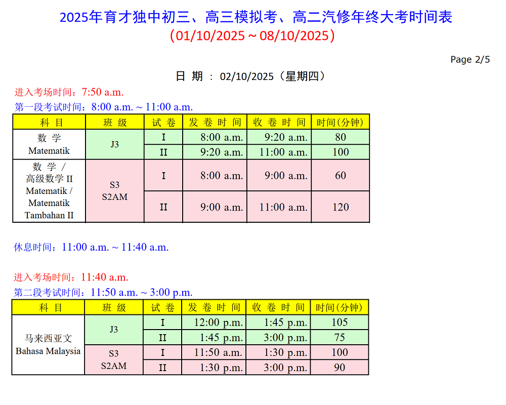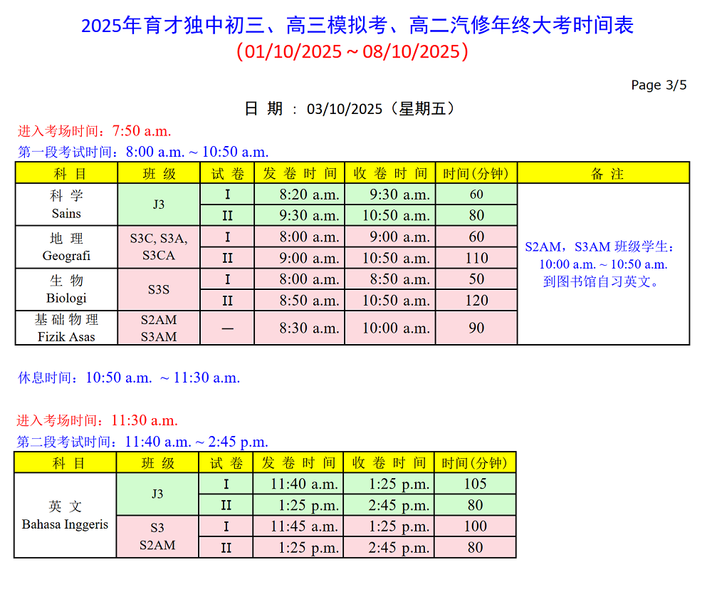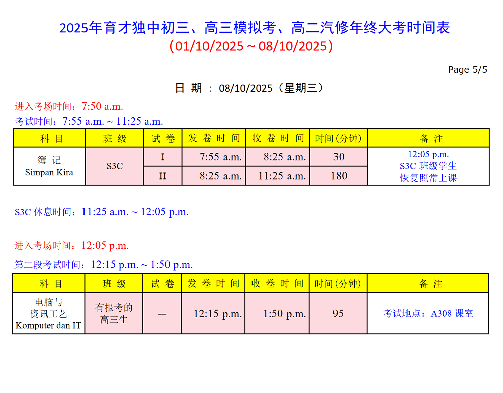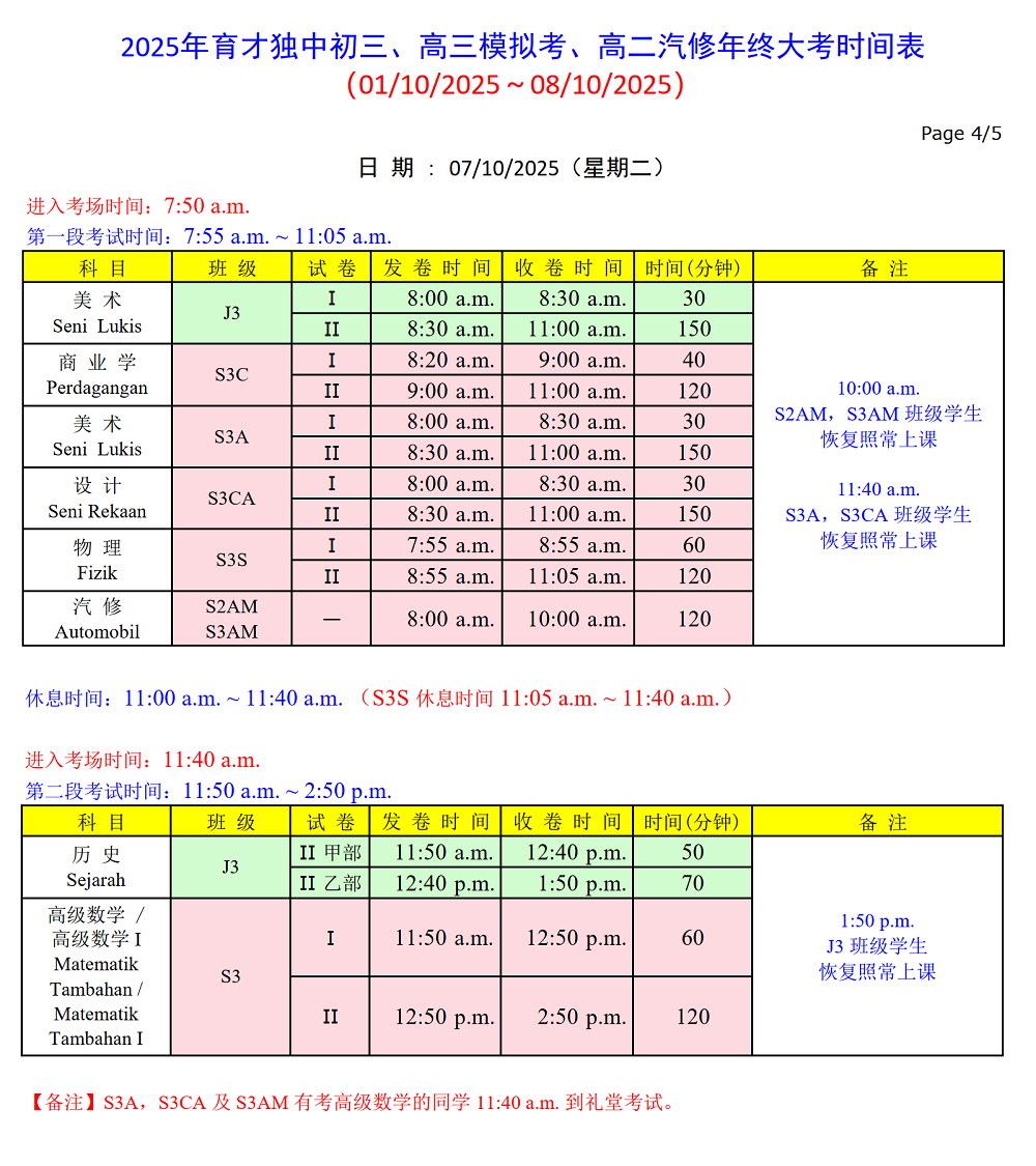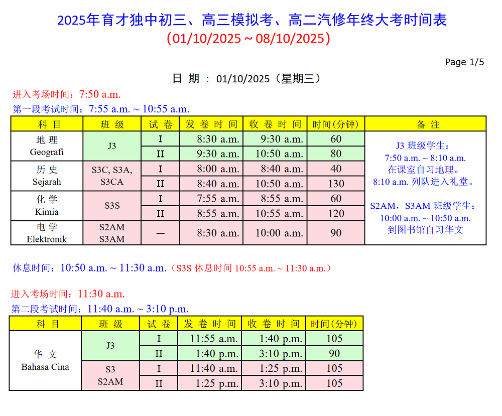 初三、高三模拟考及高二汽修年终大考 01.10.2025 ~ 08.10.2025 请点击以下图片浏览和下载考试时间表。