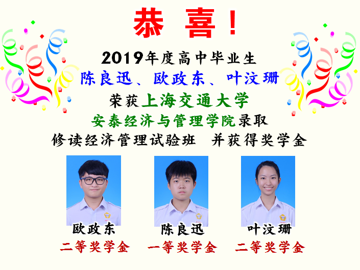 恭喜2019年度高中毕业生:陈良迅、欧政东、叶汶珊 荣获上海交通大学录取,修读经济管理试验班,并获得奖学金(陈良迅获一等奖学金,欧政东和叶汶珊获二等奖学金)。