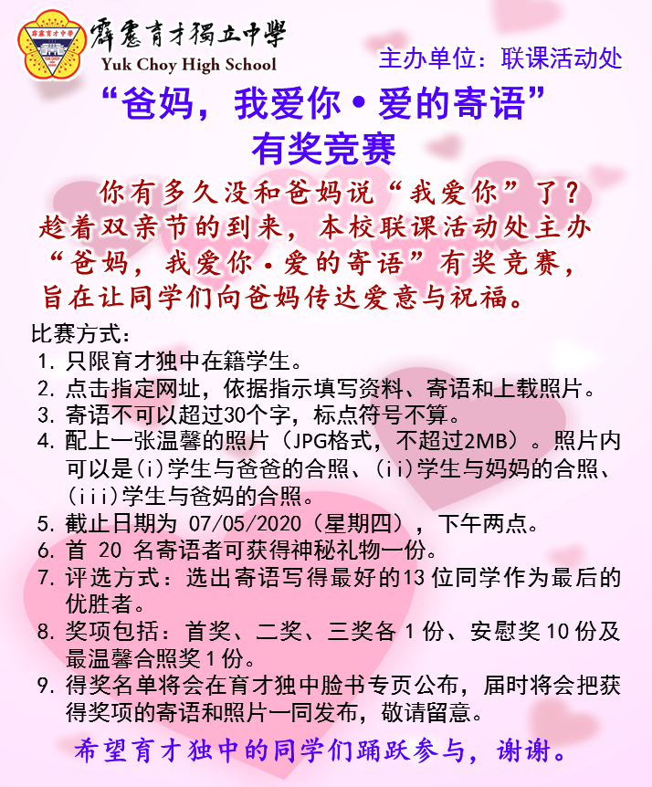 4)配上一张温馨的照片(JPG格式,不超过2MB)。照片内可以是 (i) 学生与爸爸的合照、(ii) 学生与妈妈的合照、(iii) 学生与爸妈的合照。