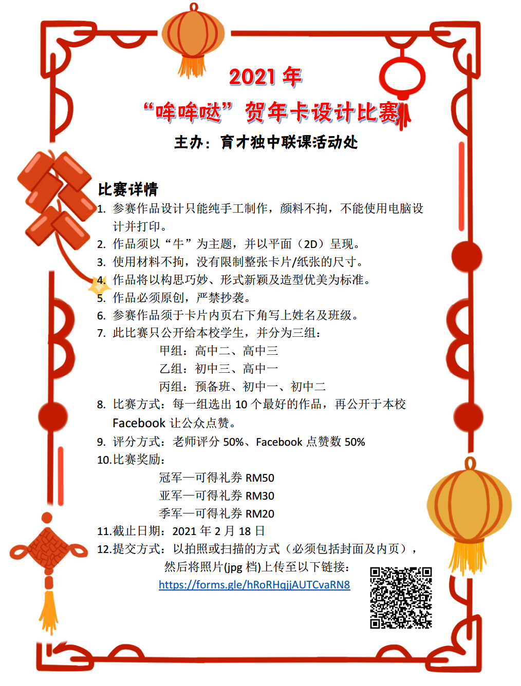 “哞哞哒” 贺年卡设计比赛 本校联课活动处主办的《“哞哞哒”贺年卡设计比赛》,即日起开始至2月18日,同学们,发挥你们的创意吧! 提交方式:以拍照或扫描的方式(必须包括封面及内页),然后将照片(jpg档)上传至以下链接: https://forms.gle/hRoRHqjjAUTCvaRN8