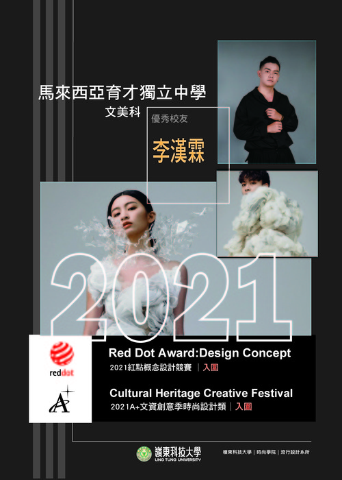 恭喜本校2016年文美班毕业校友李汉霖(现于台湾岭东科技大学就读流行设计系)入围“2021红点概念设计竞赛”及“2021 A+文资创意季时尚设计类”。