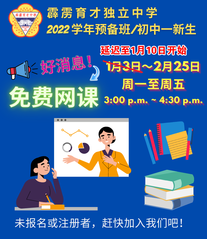 请注意!育才独中为2022学年预备班和初中一新生提供的免费网课,将延迟至1月10日开始,时间是周一至周五,下午3点至4点30分。