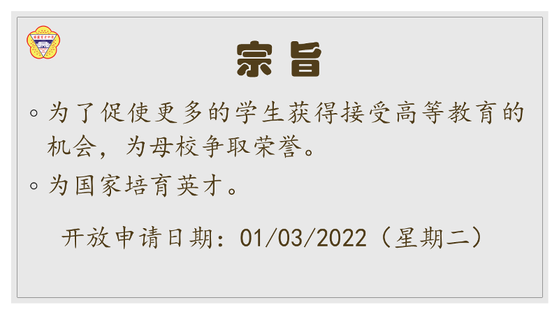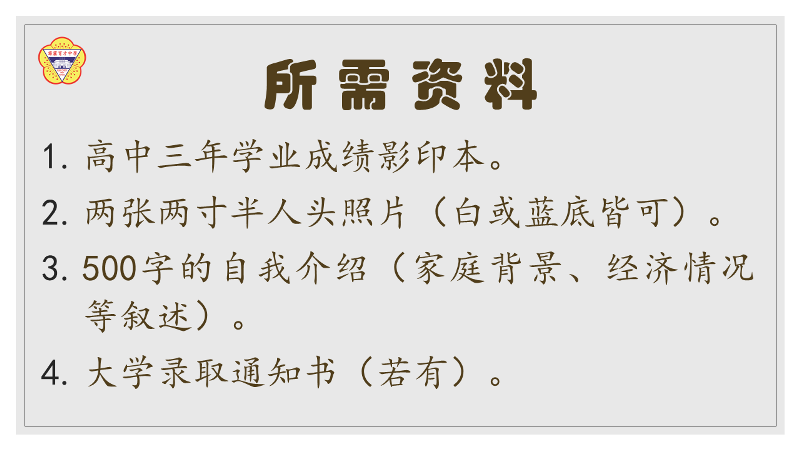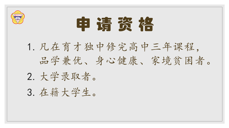 申请资格:凡在育才独中修完高中三年课程、品学兼优、身心健康、家境贫困的大学录取者或在籍大学生。