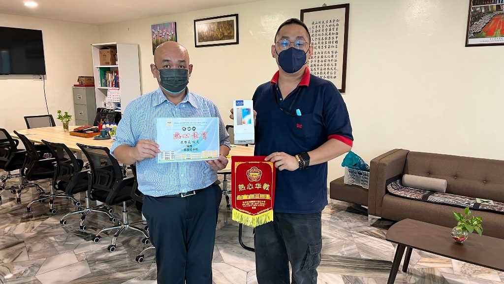 感谢本校校友苏哲豪先生捐赠一部智能手机予本校,以作为公务上的沟通与资讯传达用途,由廖庭方校友(右)代表移交,黎镇光校长(左)接领。