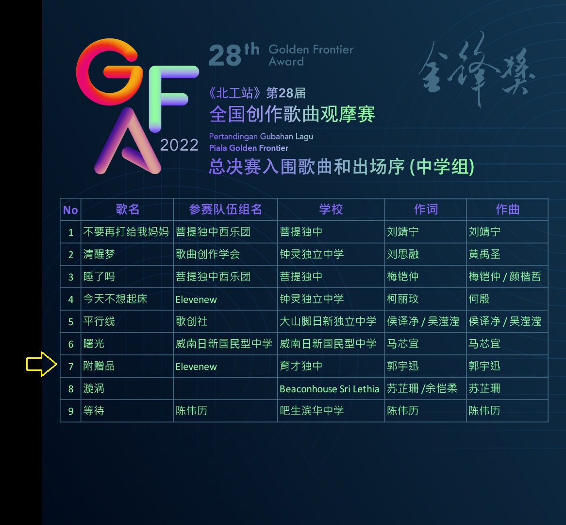 《附赠品》(作曲、作词): 入围 中学组 决赛