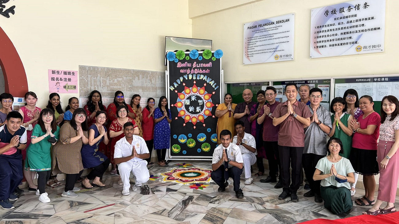 黎镇光校长与各部门行政老师、教职员穿上色彩鲜艳的印度传统服装,连同三位印裔学生一起在大厅的“油灯米绘图”前拍照,喜迎这个象征光明的节日到来。