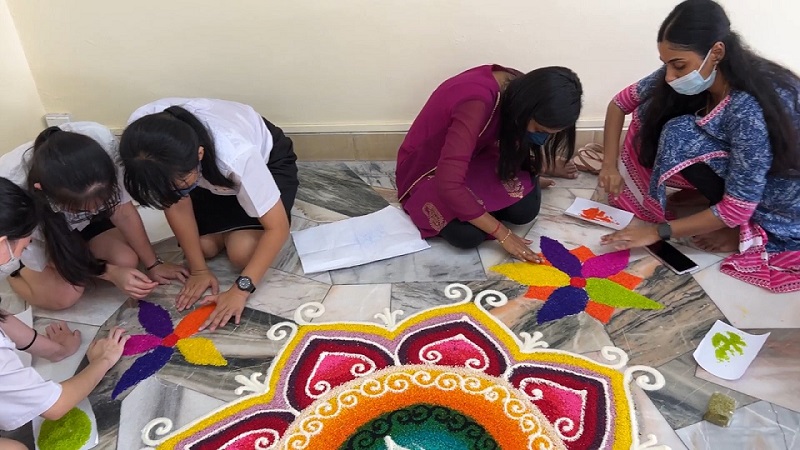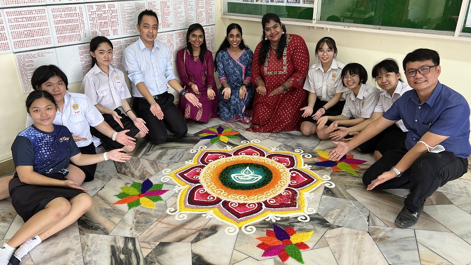 上星期趁着屠妖节的到来,本校三位印裔老师带领高二理班的六位同学一起制作源自于印度的传统艺术 — — 米绘图(Kolam),与全校师生一起分享屠妖节的祝福、光明和欢乐。