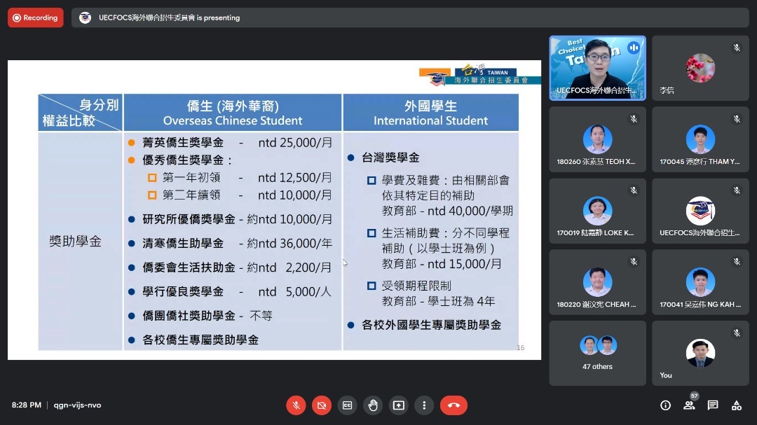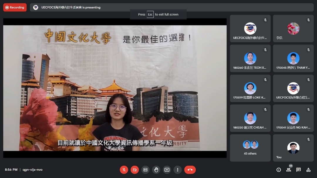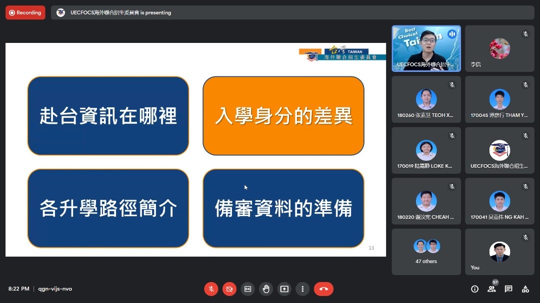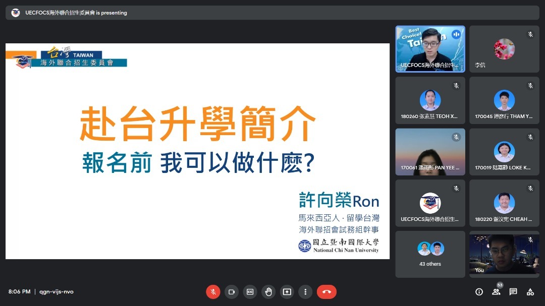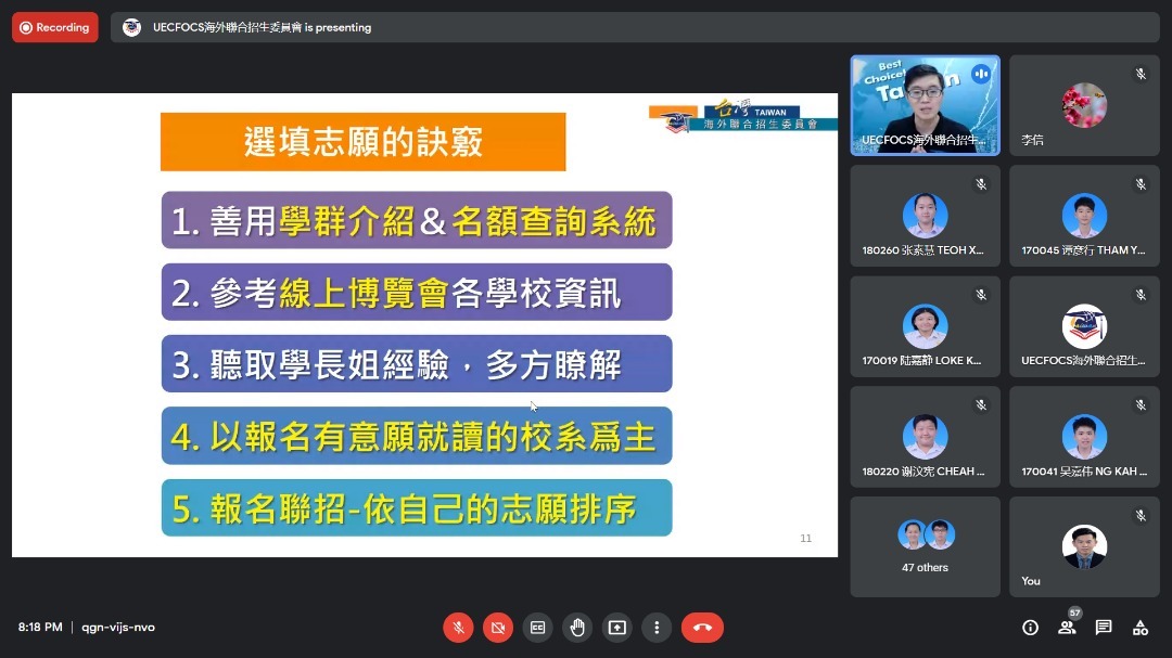 本校50名有意到台湾升学的学生,日前参加由台湾海外联招会举办的“赴台升学线上讲座”。