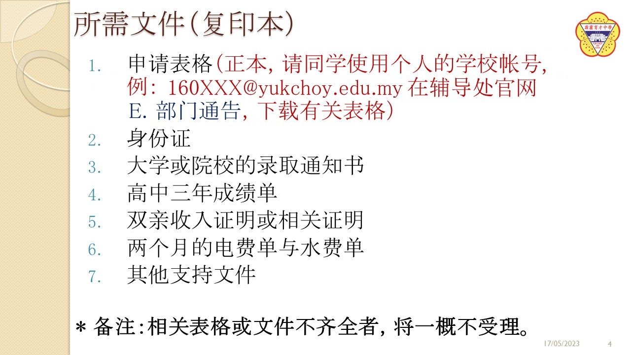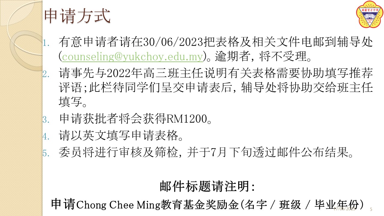 由热心人士张志明税务顾问所成立的“Chong Chee Ming教育基金奖励金”目前已开放申请,有意要申请的校友可以到本校辅导处的网页 https://sites.google.com/yukchoy.edu.my/counselling 查询和申请。