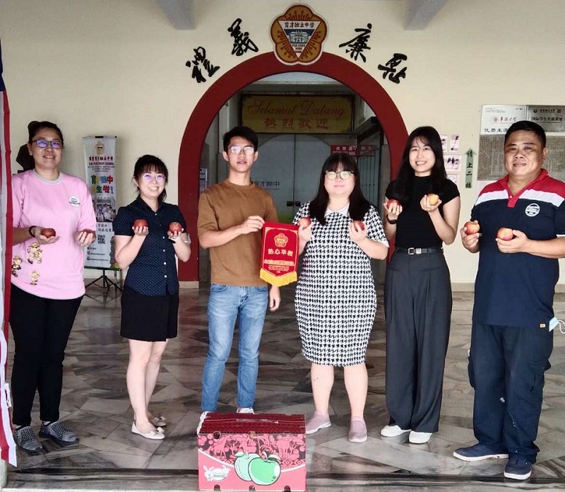 中秋佳节将至,本校2018年高三理班毕业校友邓启仲(左三)不忘师恩,特意送上鲜甜的苹果予本校教职员享用,寓意“苹”安喜乐。本校事务主任锺国华老师(右起)、校长秘书助理邓易庭小姐、校长秘书潘晓晶小姐、事务助理陈诗韵女士(左起)、账务主任王诗雯小姐代表接领。