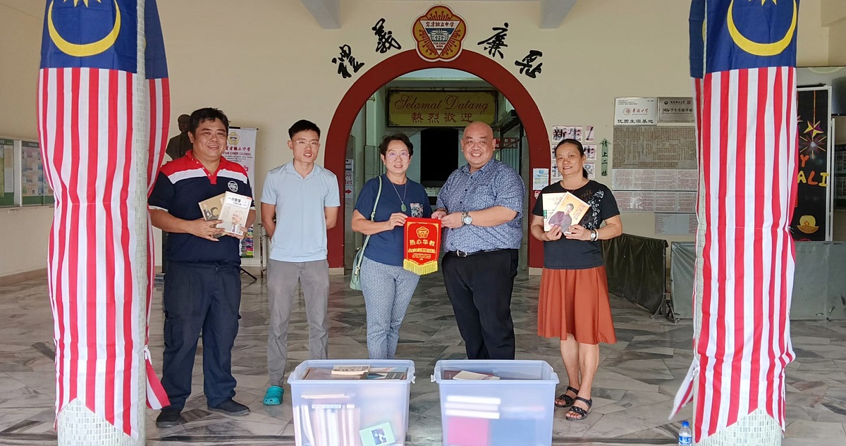 本校感谢校友梁宝珠女士(右三)在长子陈岸(左二)的陪同下,把自己的部分藏书捐赠给本校图书馆,并且捐赠1000令吉予图书馆添购新书。黎镇光校长颁赠锦旗予梁校友以示感谢,本校事务处主任锺国华老师(左)和图书馆助理陈秀枝女士(右)陪同接领赠书。