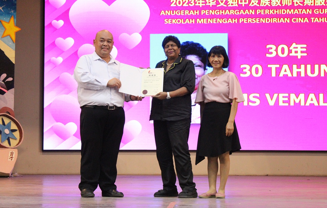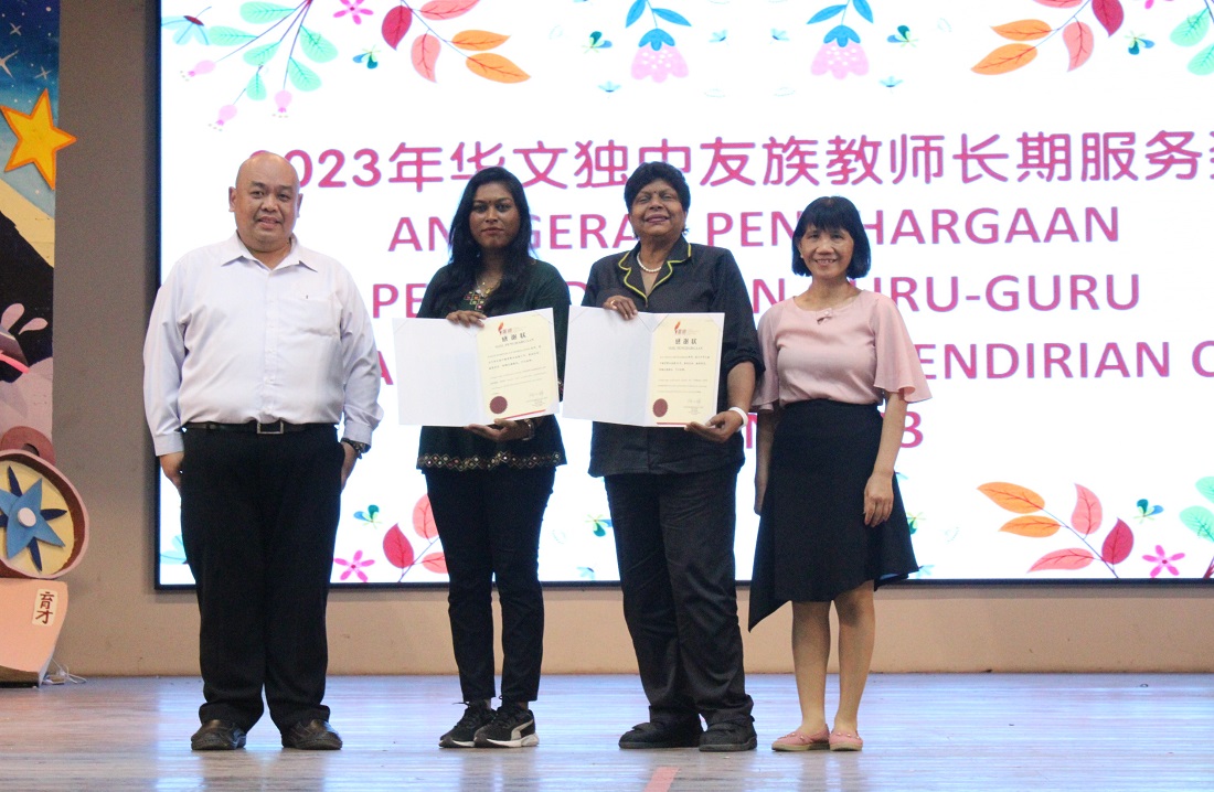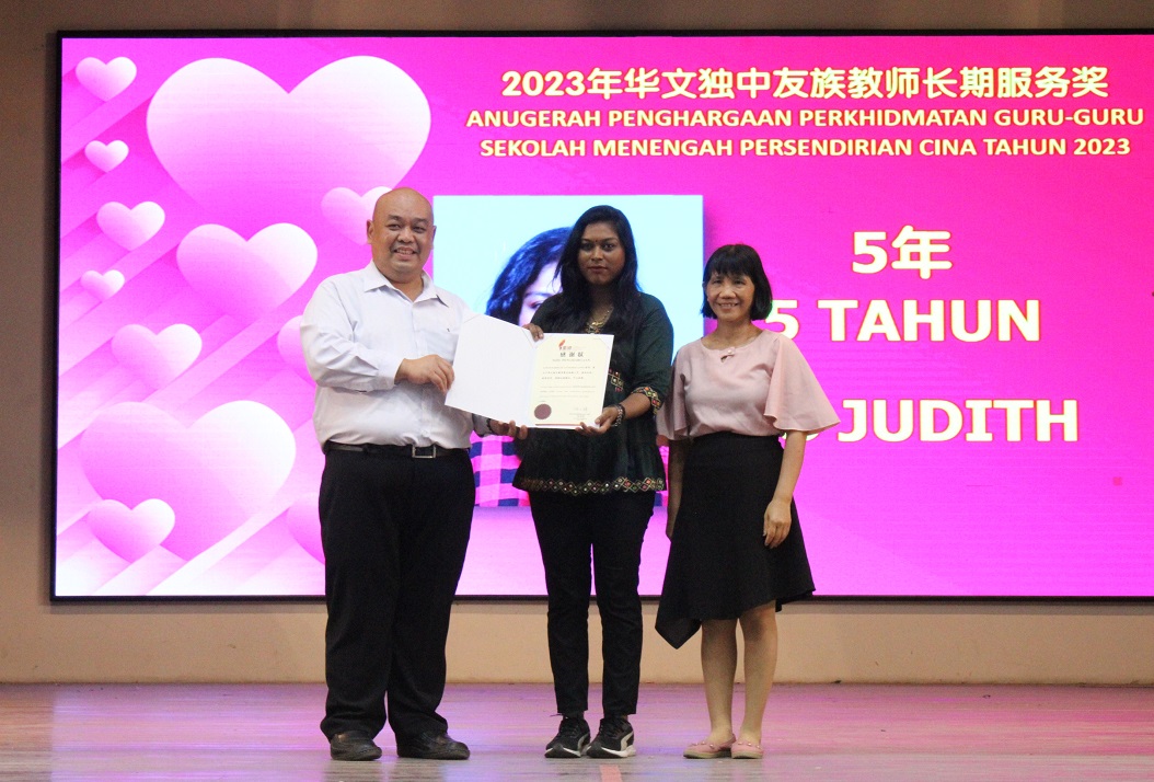 此外,校方也颁发董总2023年华文独中友族教师长期服务奖,本校获奖的是英文老师 Vemala 老师(服务30年)和教务处助理兼马来文老师 Judith 老师(服务5年)。