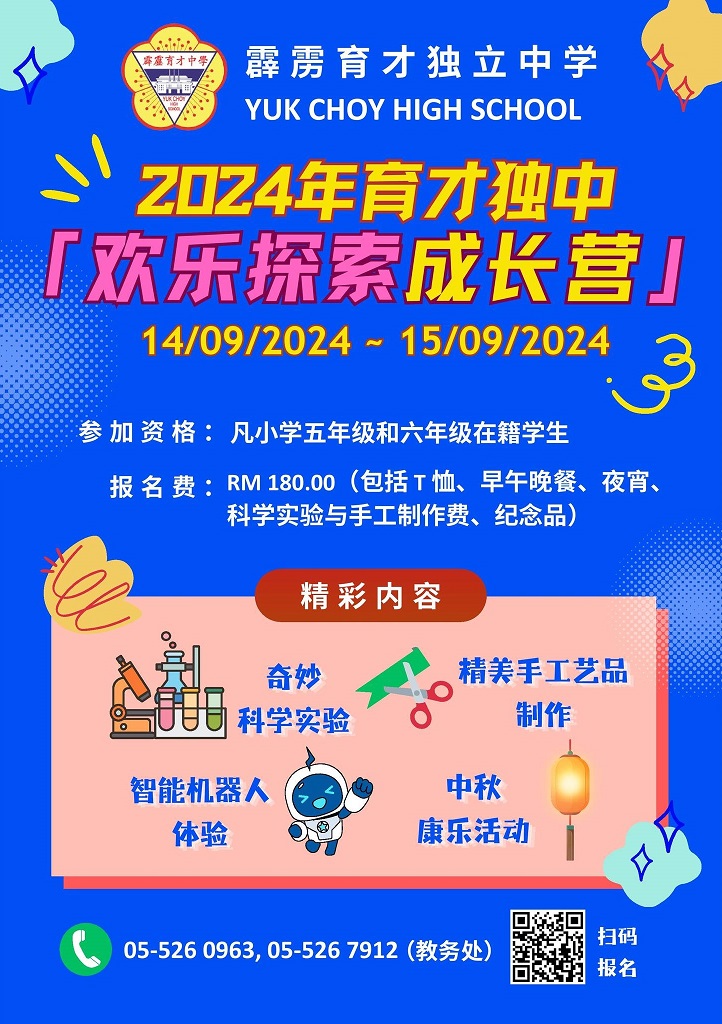 想在学校假期给孩子一个不同的学习体验吗?欢迎报名参加即将于9月14日至15日(星期六及日)举行的“2024年育才独中欢乐探索成长营”。