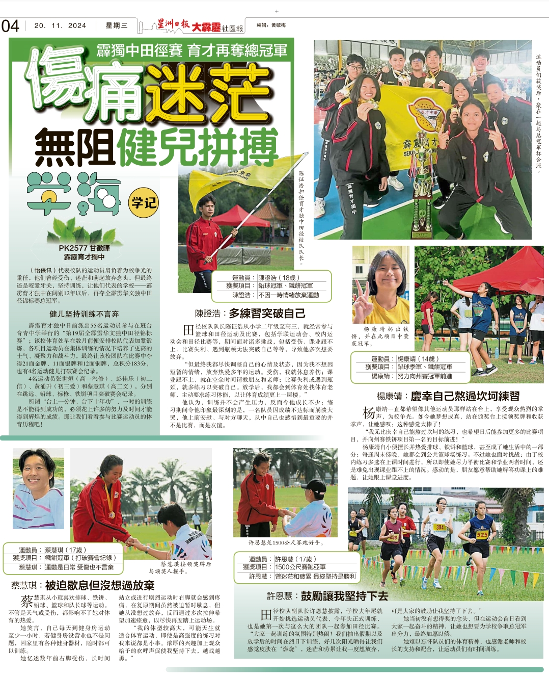 本校甘征晖同学(高一理)除了是本校摄影队的队员外,也加入《星洲日报》成为“学海学记”。他这篇专访本校运动员的专题报道成功获得录取,并刊登在今天(2024年11月20日)的《星洲日报大霹雳》,可喜可贺!https://www.facebook.com/share/p/1YGxx5PAYp/