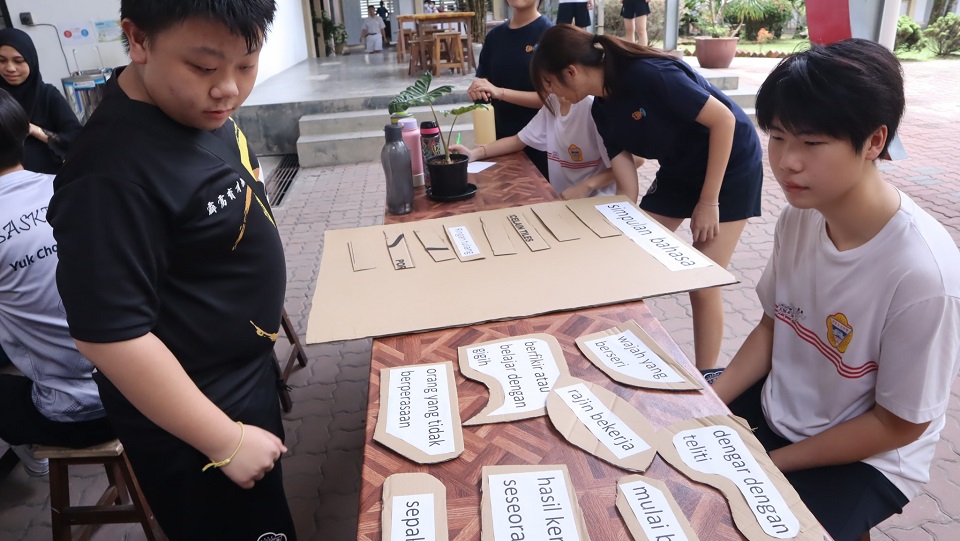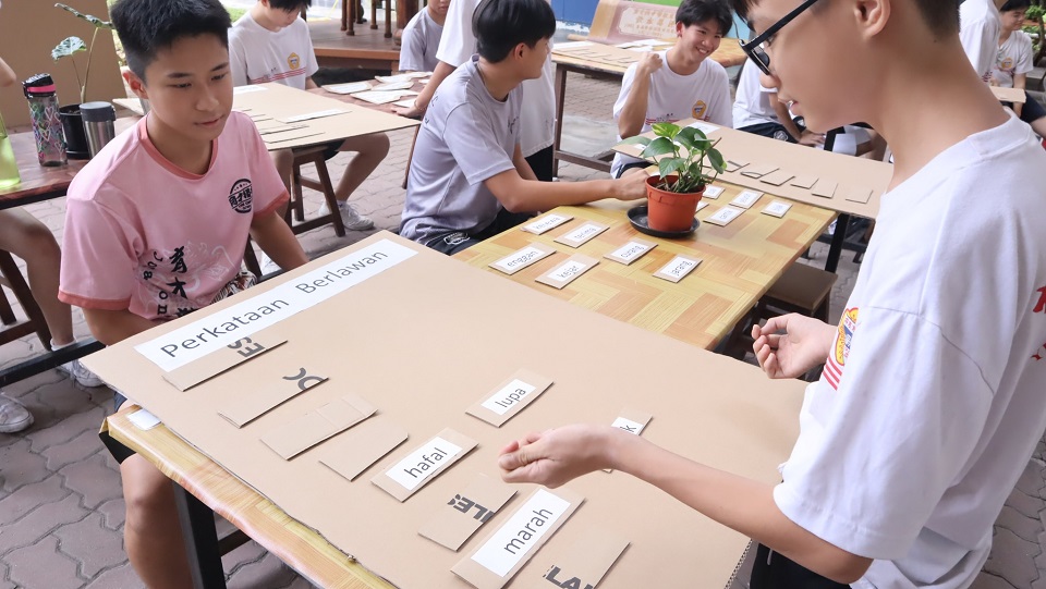 配合国语月的到来,国文科老师携手同学们精心策划了一系列趣味活动。学生们在第二次下课时段参与挑战,通过轻松有趣的游戏方式,学习和辨识“同义与反义词”(Perkataan Seerti dan Berlawan)以及“马来习语”(Sim­pu­lan Bahasa)