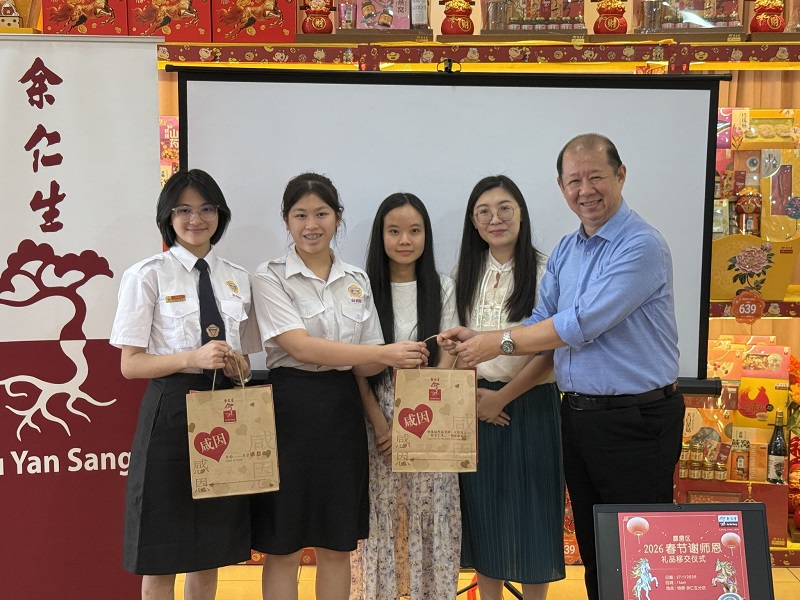 余仁生暖心谢师恩 新春送暖表心意 2026年1月27日发布 余仁生关怀教育、感念师恩,特别举行“谢师恩仪式”,并献上精心准备的新年礼品,向辛勤付出的教育工作者致以诚挚感谢与祝福。 本校宣教处吴君仪老师及职员锺铭惠小姐受邀出席礼品移交仪式。两位学生代表也一同参与其盛,在师生温馨互动中传递感恩之情,现场洋溢着浓浓的新春气息。 一份礼盒,承载着满满心意,也温暖了老师们的心。余仁生透过持续推动“谢师恩”活动,以实际行动宣扬尊师重道的美德,让感恩之情在新春佳节中悄然流转,为校园增添温馨与喜悦的气息。 |
