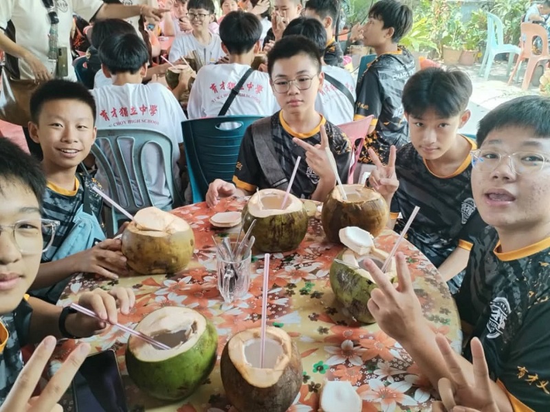 午后阳光渐强,大家来到椰子档口享用整粒新鲜椰水。清凉的椰水顺吸管中缓缓入口,瞬间驱散了炎热与疲惫。无添加、无加工,这份来自大自然的甘甜让同学们感受到最纯粹的滋味。简单,却令人满足。