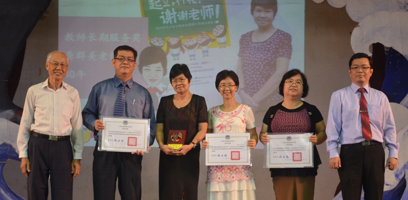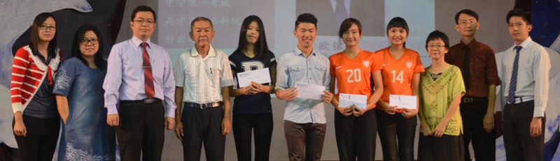 2014年度统考全国成绩特出考生颁奖仪式:左起叶丝淣老师、古景遥老师、苏民胜校长、本校董事会总务吴章明、