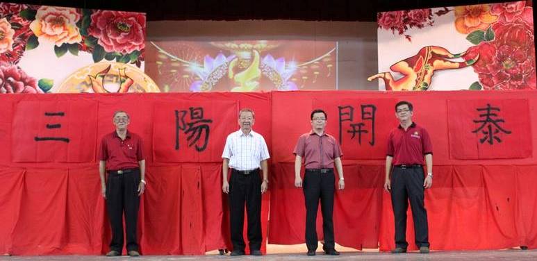 嘉宾现场挥毫,左起董事丘锦龙和王瑞国、苏民胜校长、谢志明副校长。