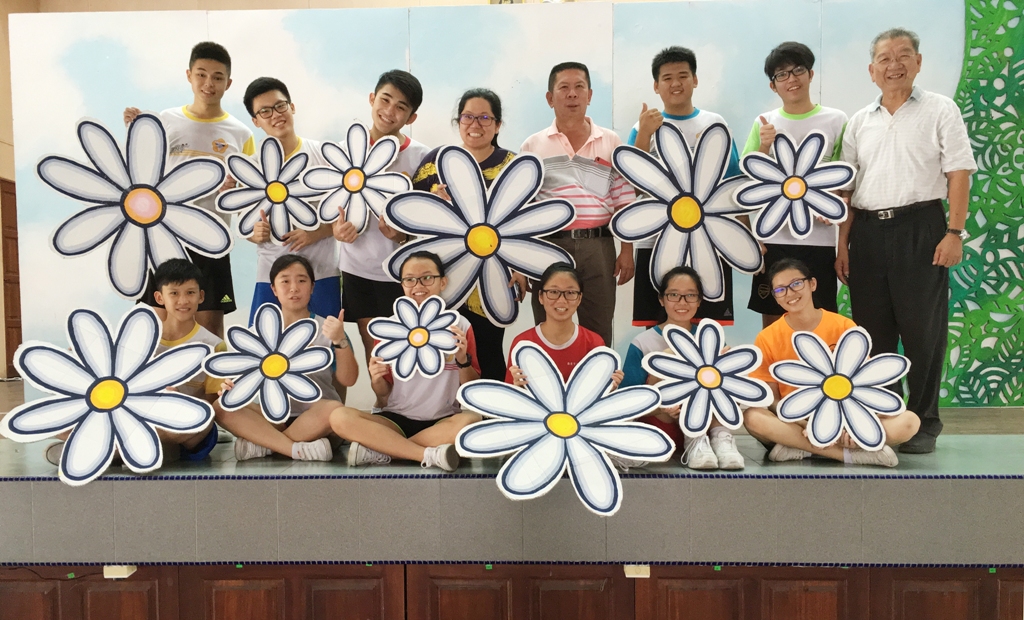 负责布置舞台的育才独中师生与董事王瑞国(后排右一)、大会主席陈锦发(后排右四)、古景遥老师(后排右五)合照,热烈欢迎大家出席联欢宴会。