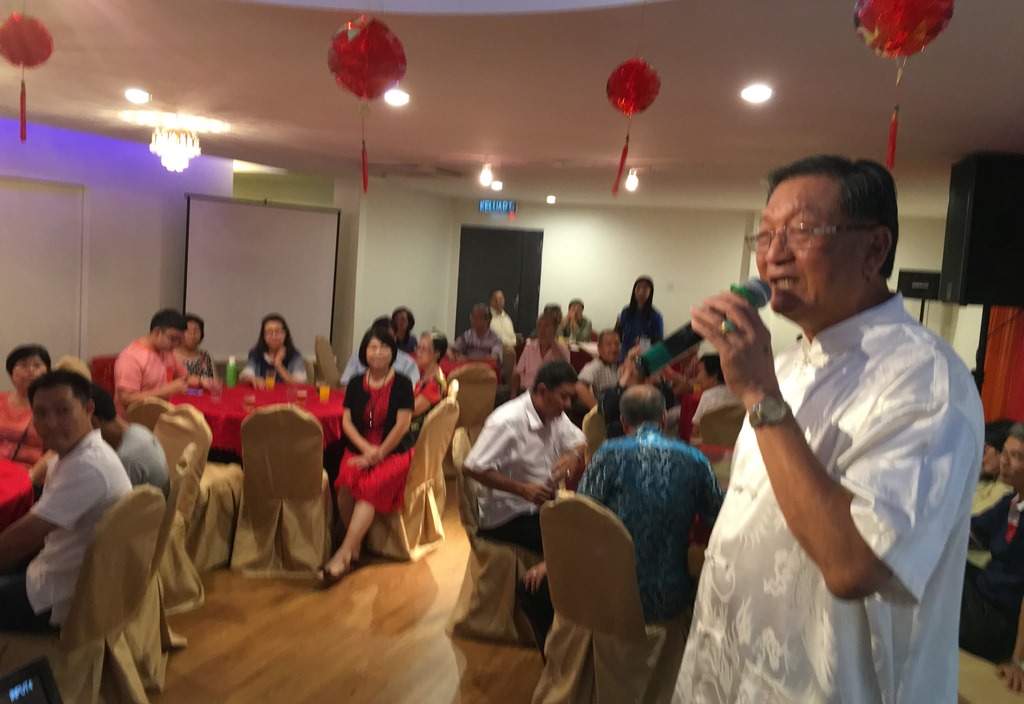 团拜工委会主席陈道恭致词,站者左起陈锦蓝、曾庆安、苏民胜、曾宪源。