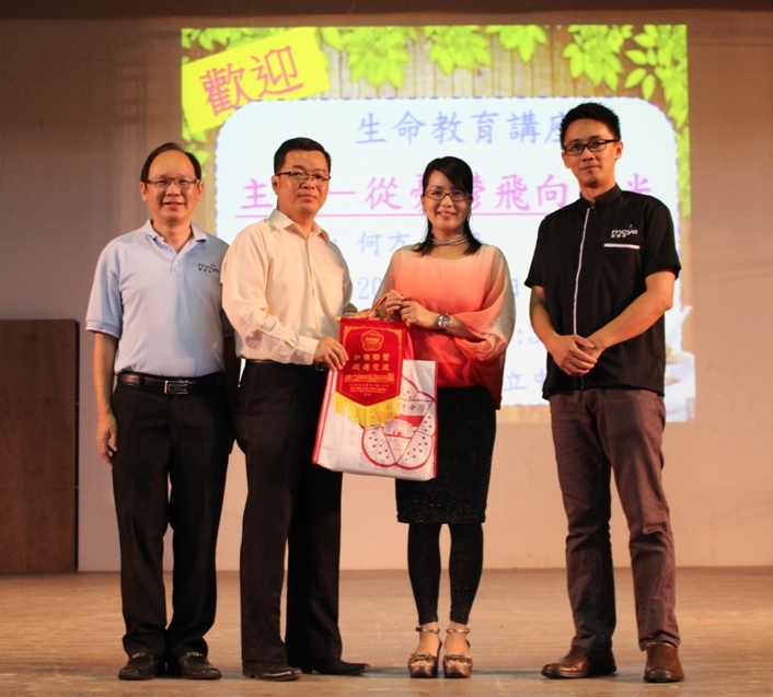 苏民胜校长(左二)颁赠纪念品给主讲人何方(右二),左一为马来西亚基督教青年协会(霹雳州分会)顾问黄一豪,右一为马来西亚基督教青年协会(霹雳州分会)主席林明辉。