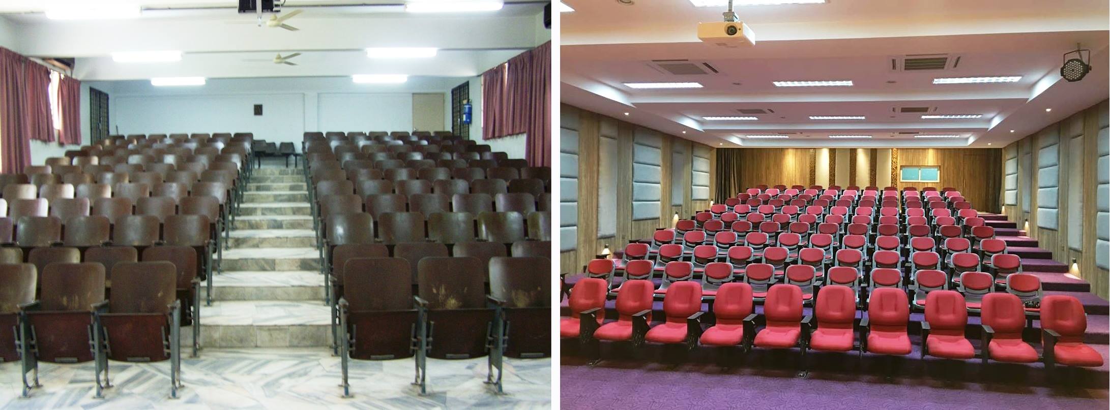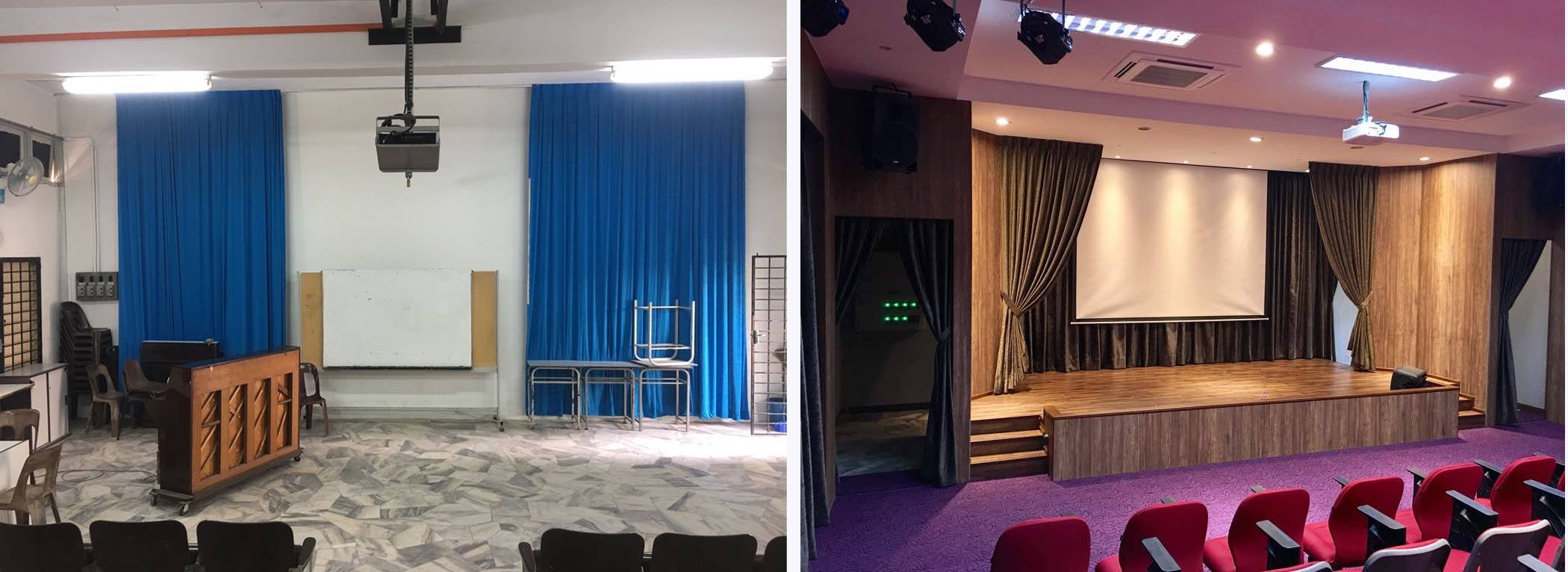 本校蔡任平讲堂设备提升工程从今年3月中开始,经过两个月半的施工时间,在5月下旬已经完成。提升工程计划包括音响设备、空调设备、隔音设备等。