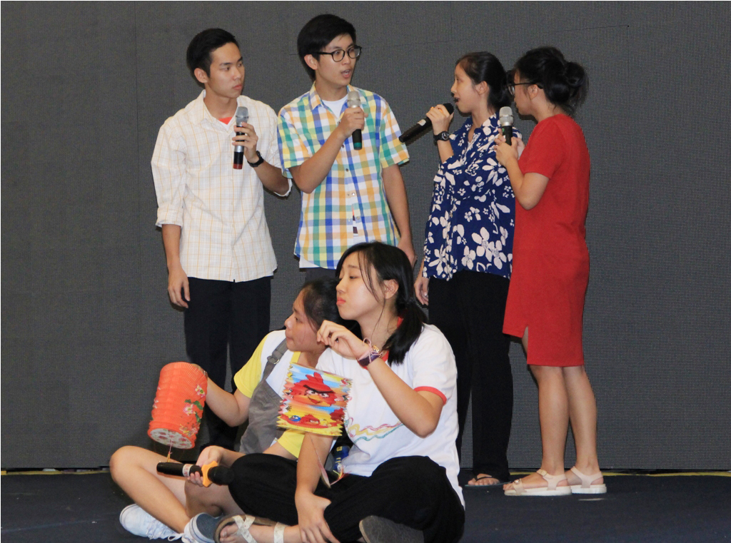经过两个星期的训练,本校学生在台上呈现温馨感人的戏剧作品。
