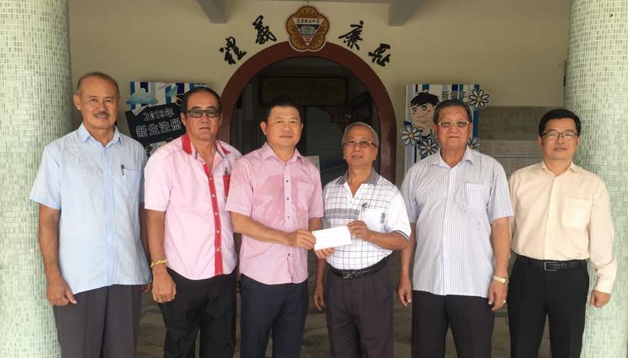 张天成(左三)移交捐款予董事长黄亚珠(右三),左起曾镇池、李喜发;右起苏民胜校长、署理董事长拿督吴国芳。