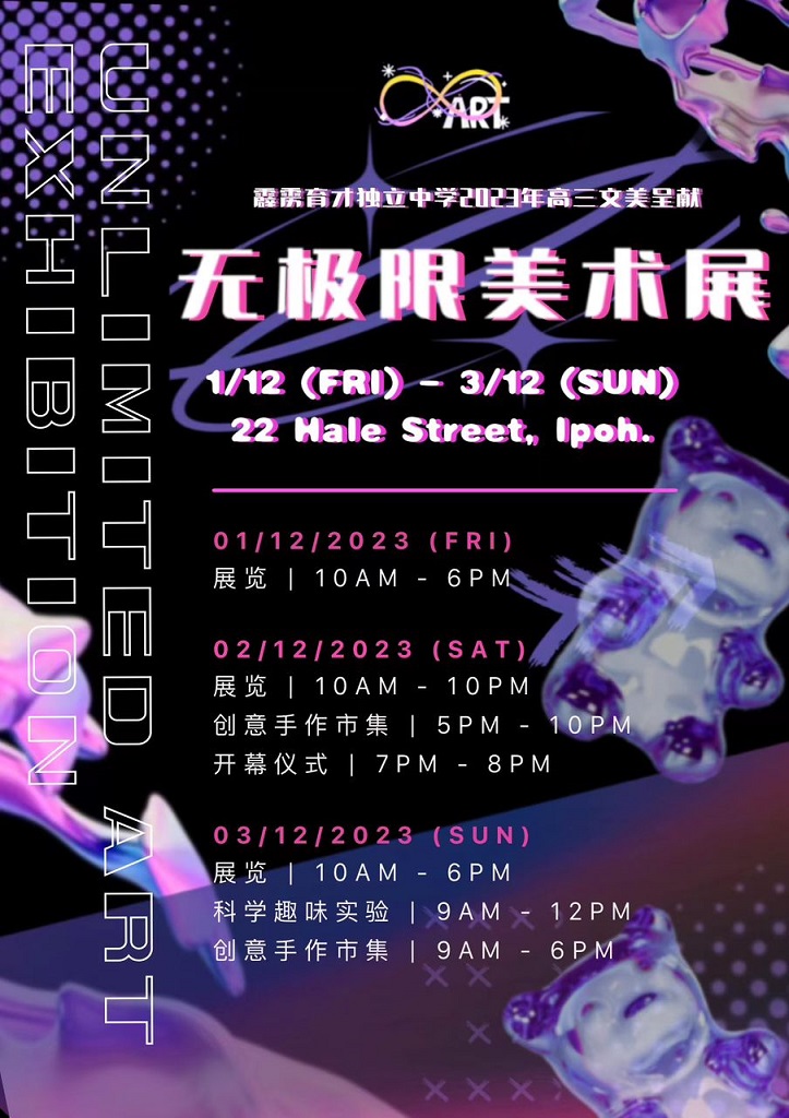 “无极限” 美术展 12月1日至3日举行 2023年11月28日发布 由本校高三文美班呈献,主题为“无极限”的美术展将于2023年12月1日(星期五)至12月3日(星期日)在怡保 22 Hale Street 盛大举行! 美术展除了有同学们的作品展览外,也有创意手作市集和趣味科学活动等节目进行。 欢迎大家呼朋唤友、携家带眷一同前来参与! 欢庆育才创校116周年纪念晚宴筵开超过130席