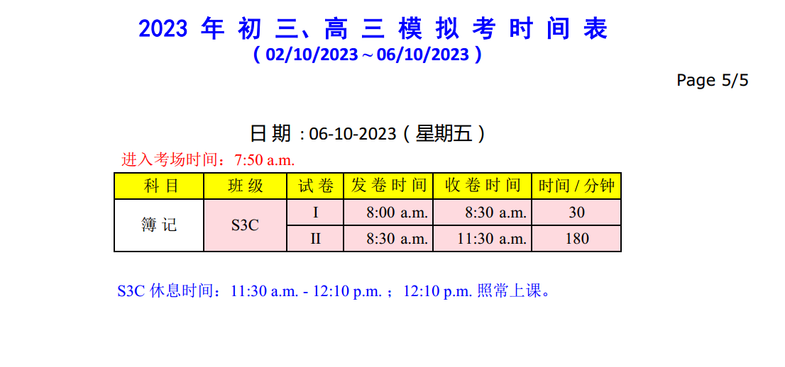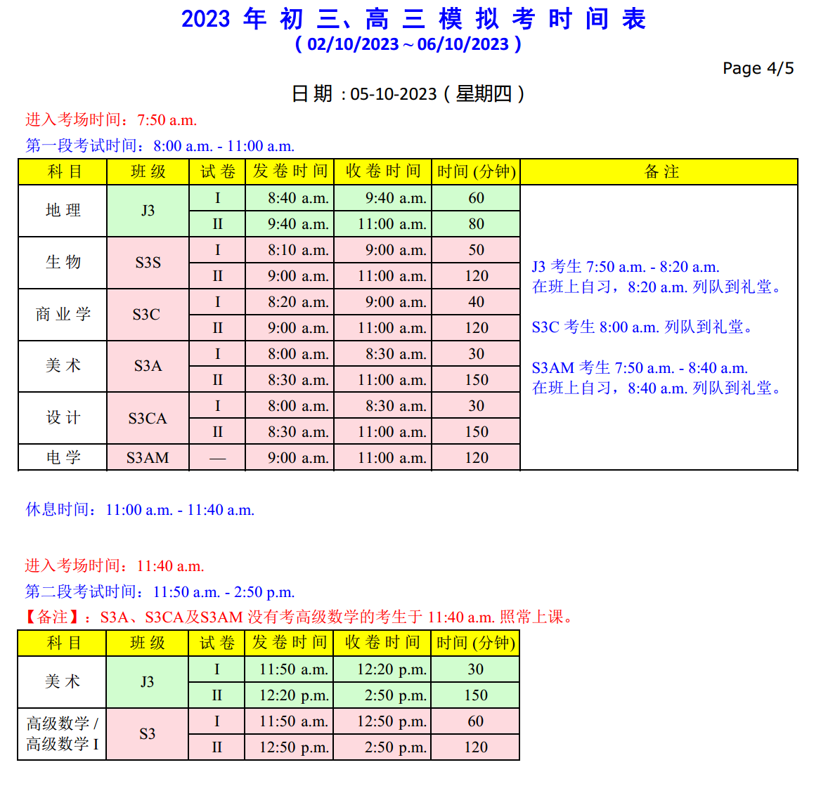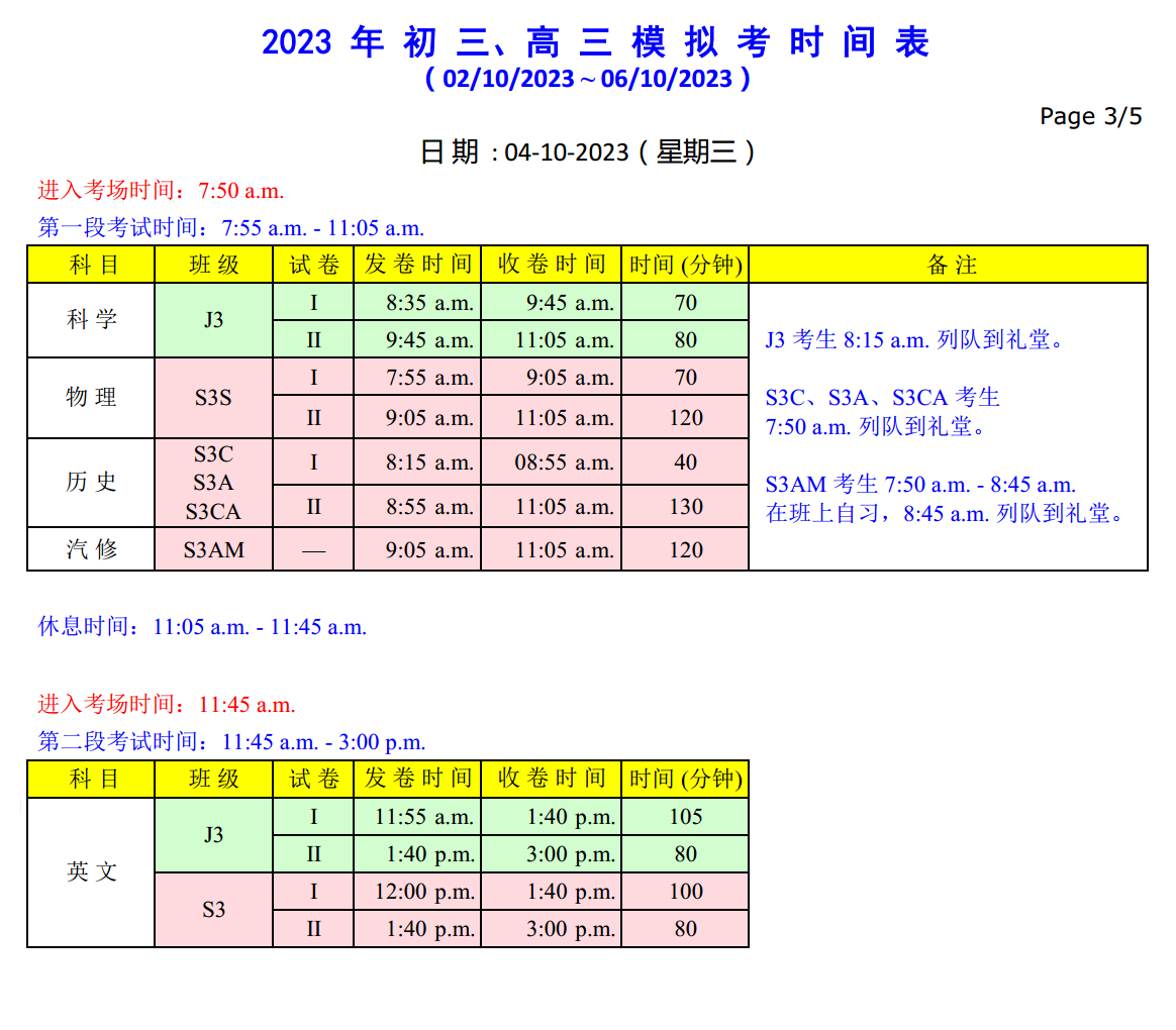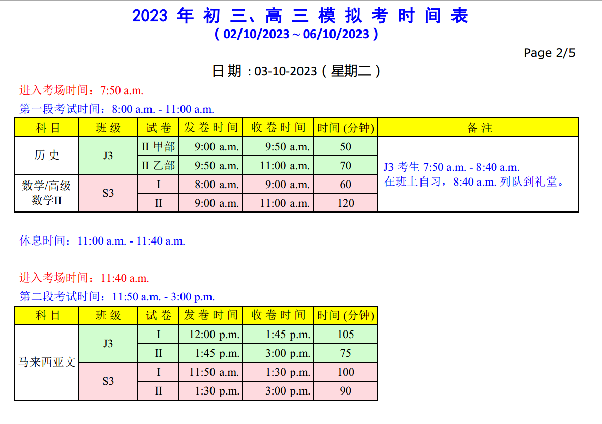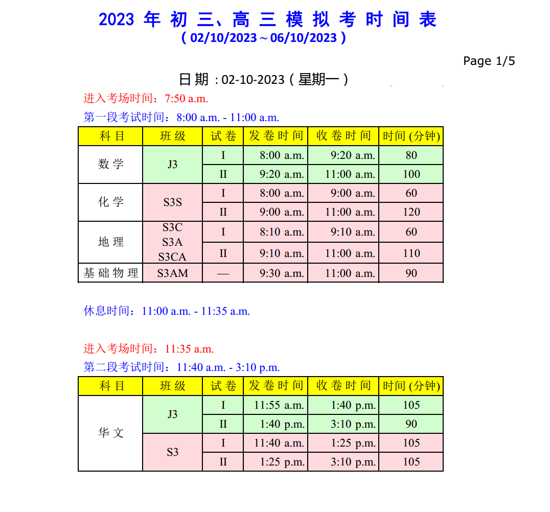 初三、高三模拟考时间表 日期:02.10.2023(星期一)~ 06.10.2023(星期五) 点击图片可浏览和下载考试时间表。