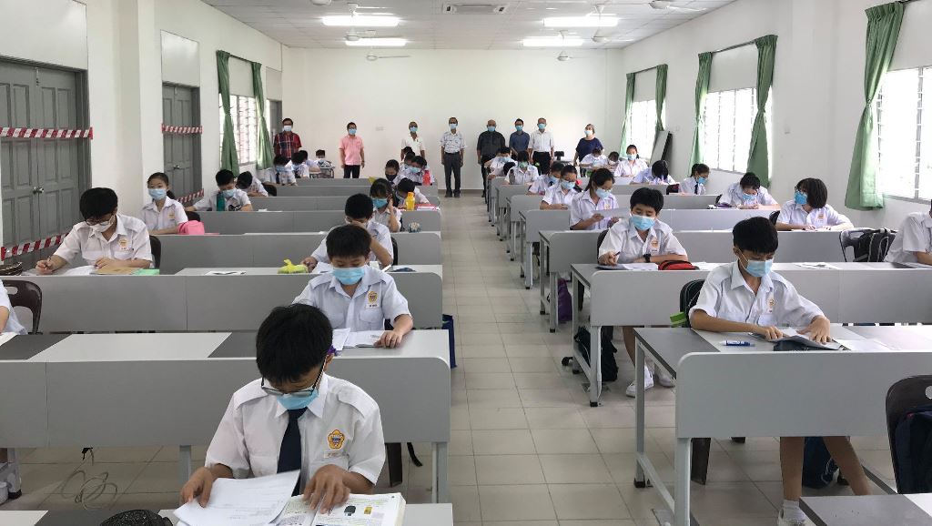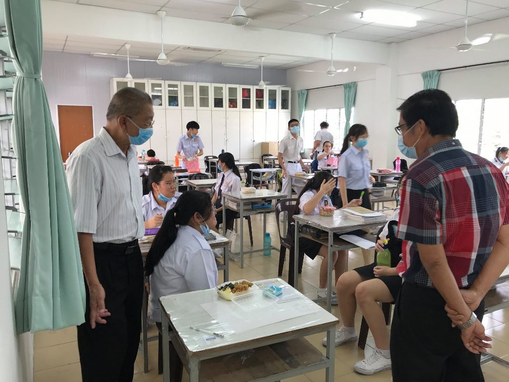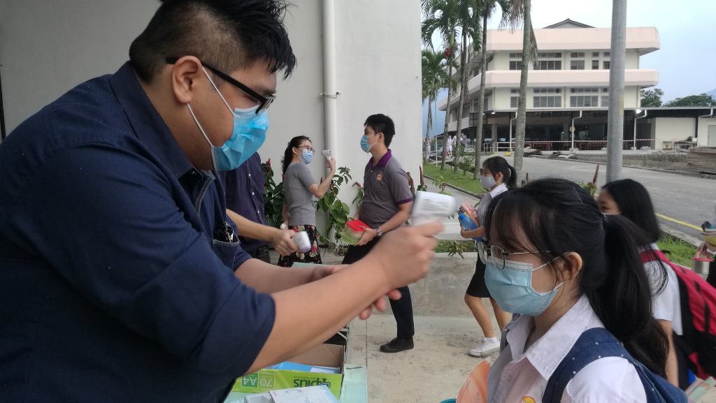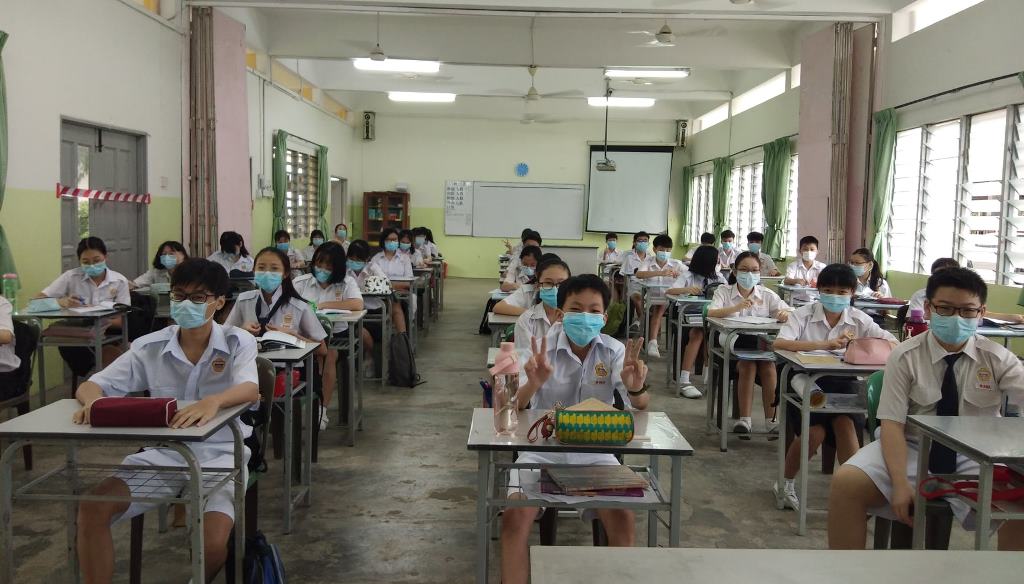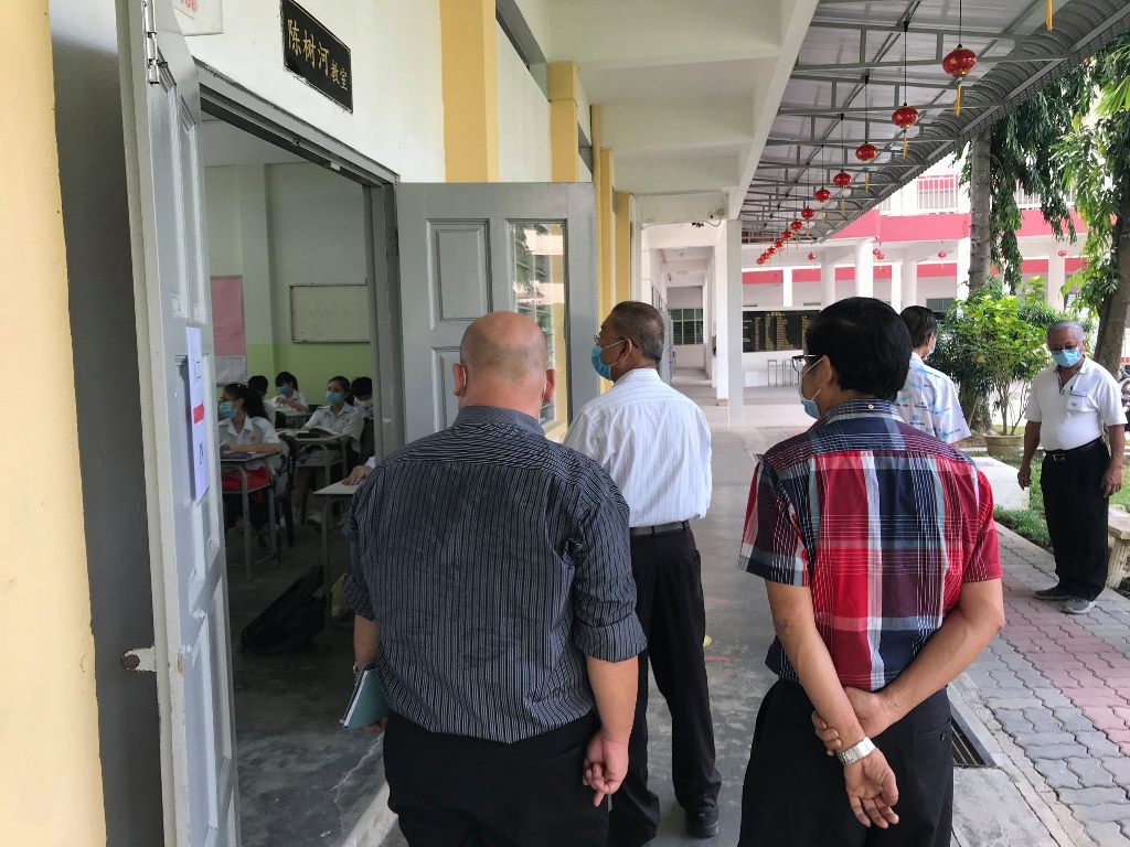 校园再次充满人气!疫情防控期间,7月15日终于迎来全校复课,值班老师每天提早到校,为全体学生测量体温。课室走廊、楼梯、大厅等地方也安排了值班老师,确保同学们根据预设的校园行走路线图,以达到复课标准作业程序。 黎镇光代校长说,本校采取第一类型复课模式,即全校学生在同一个时段上课。所幸本校拥有充足的课室,可以容纳所有学生一同上课。他说,在教育部更新了学生座位之间的标准距离后,原本需要分开两个班级上课的学生也可以在同一间教室上课,让本校有充裕的空间安排学生的地点。无论如何,黎校长也指出有些班级的人数多达40人,因此这些班级将会使用已经被打通的课室作为上课地点。 黎校长说,由于本校高三的学生已于数周前率先复课,因此在面对预备班至高二学生全面复课时也不至于手忙脚乱,各行政部门都在复课的首日完成所指定的工作,如测量体温、巡视课室、维持学生秩序等。他指出,根据训育处的统计,复课后的学生出席率超过98%,可喜可贺。 黎校长表示,学生在经过将近4个月的分离后,再次见面分外亲近是预料中事,因此他都苦口婆心劝导学生要谨记标准作业程序,不要和同学有肢体上的接触,并时刻戴上口罩,保护自己和他人。另外,休息时间时所有学生只可以在课室内享用餐点,并由值日老师监督,以免出现学生共用餐具、共桌的情况。 本校董事长黄亚珠先生、董事会总务王瑞国博士、财政黄伟生先生、副财政刘子真先生、查账张文义先生也特别在复课首天抽空到校巡视学生的复课情况,并对师生们的表现感到满意。 文、照片:宣教处