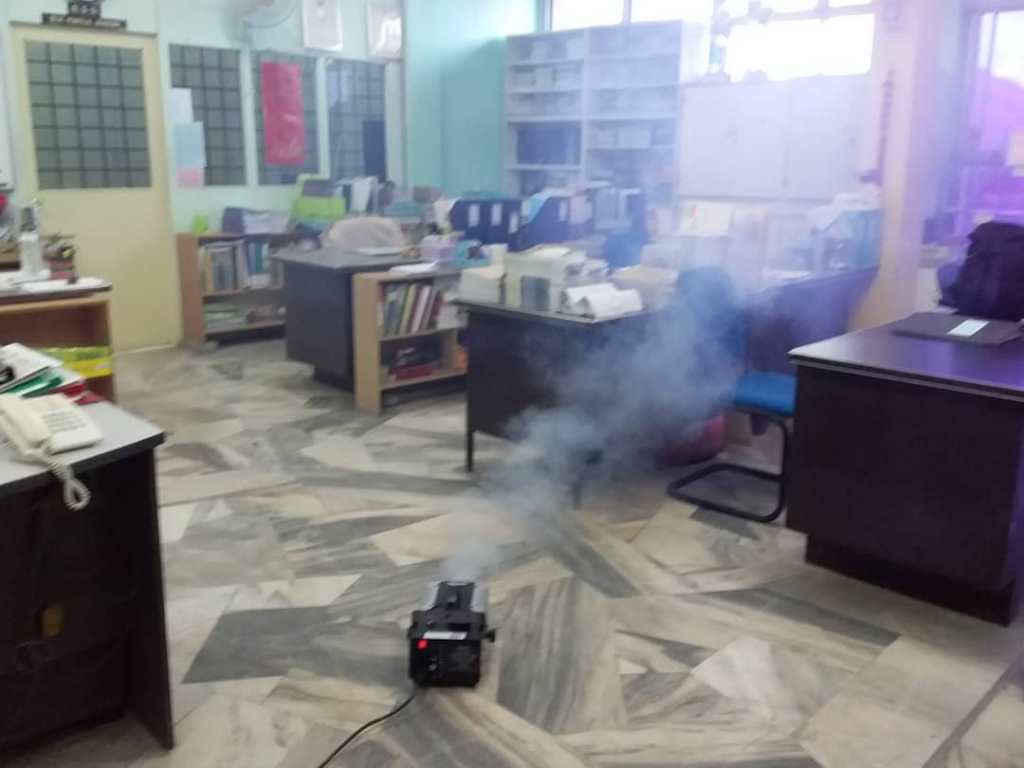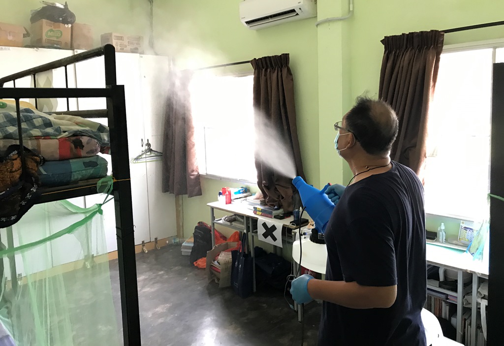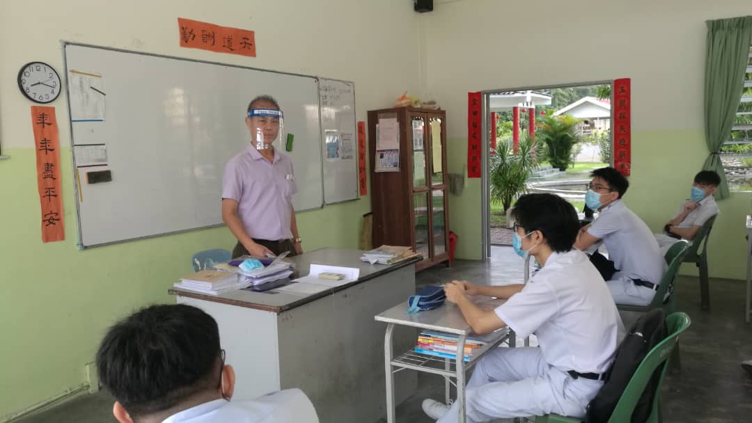 黎镇光代校长巡视复课后的课室情况。 感谢2000年毕业校友马贤义、张爱鸣和蔡常丰捐赠消毒药水及为学校消毒