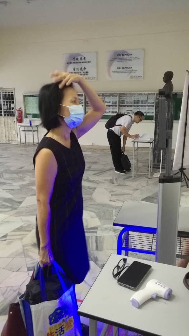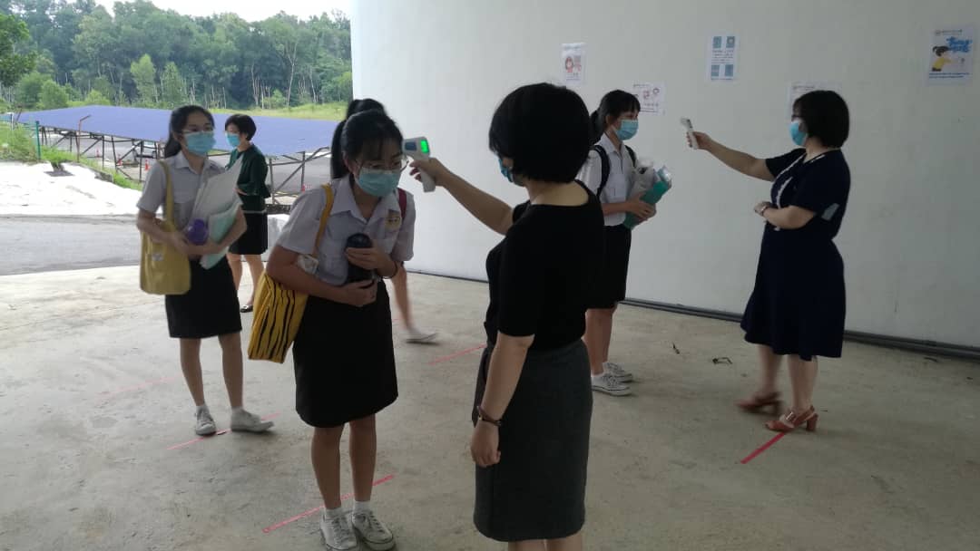 学校也透过红外线体温测量设备监督每位学生的体温。 .