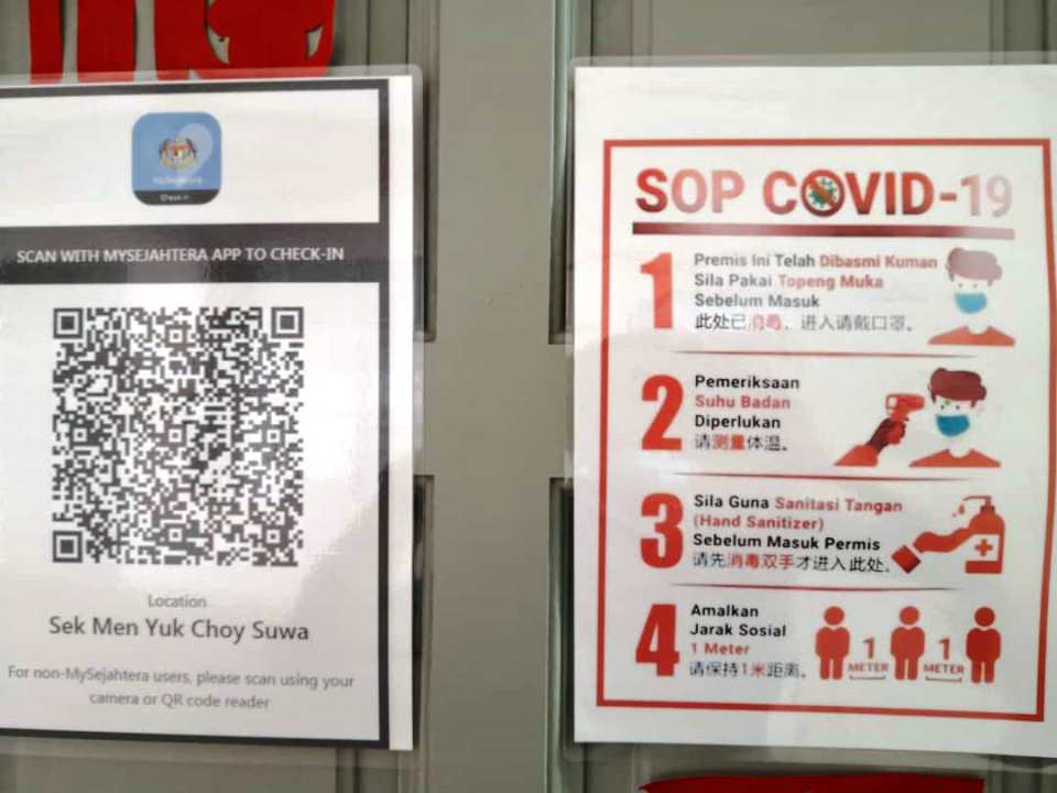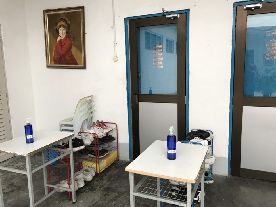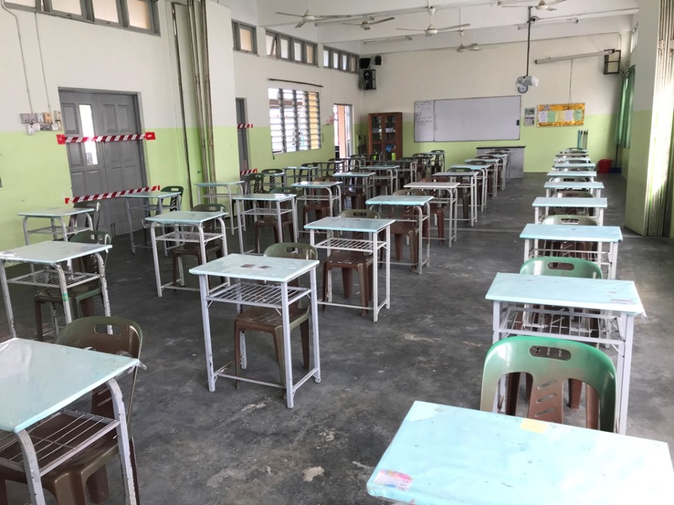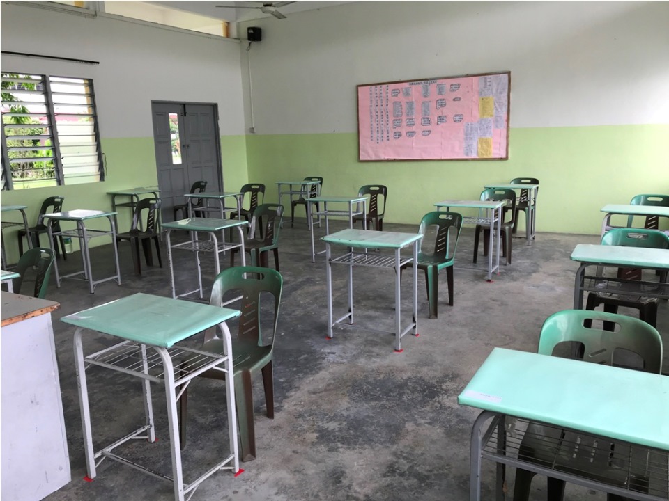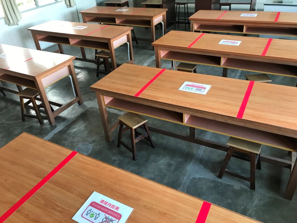 【复课防疫措施】教室 随着复课的日期越来越接近,本校做好防疫措施,让师生们安心回校,在安全的环境上课。每间教室备有搓手液和测温器,教室里的学生桌椅都保持至少一米的距离,也准备麦克风音响系统供教师授课使用。此外,校方为师生们安排了校园里的上课路线,在楼梯贴上行动路线的方向箭头标志。