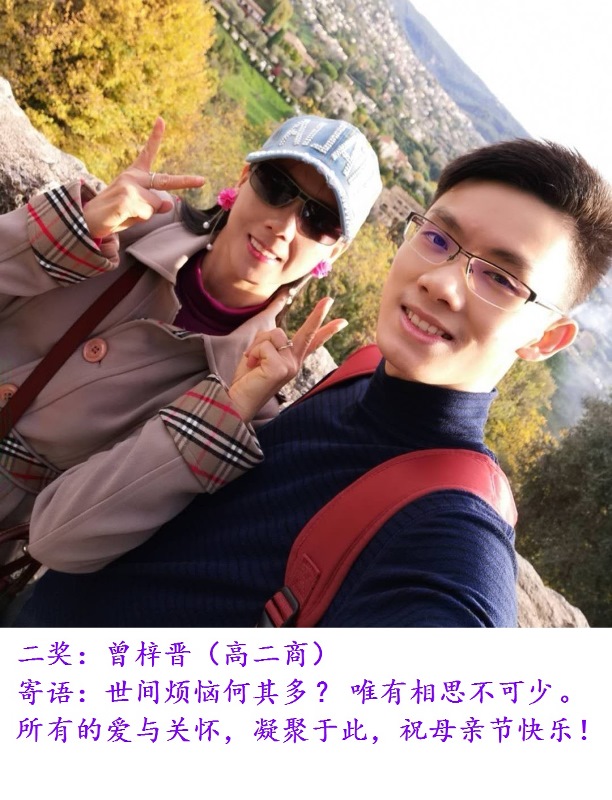 “爸妈,我爱你 • 爱的寄语” 有奖竞赛成绩揭晓啦! 【首奖】:朱婧雯(高二理) 寄语:爸妈,我很少跟你们谈心,但你们永远是我最大的依靠,谢谢你们,我爱你们。 . 【二奖】:曾梓晋(高二商) 寄语:世间烦恼何其多?唯有相思不可少。所有的爱与关怀,凝聚于此,祝母亲节快乐! . 【三奖】:高文谏(初三孝) 寄语:在成长的道路上,您把最好的给了我。如今我只想对您说:“妈,谢谢您,我爱您!” . 【安慰奖】: 陈怡蒨(初二信)、胡仳恩(高一文美)、梁嘉雯(高三理)、梁嘉伟(初二信)、张恩仪(初三信)、区靖仪(高三商1)、潘骏宥(高二文)、李淑伶(初三孝)、刘敏思(高一文)、周洁诗(初二忠) . 【最温馨合照奖】:朱婧雯(高二理) . 首 20 名寄语者也可获得神秘礼物一份。 联课活动处在近期内会发通知到所有获奖学生的个人学校电邮。
