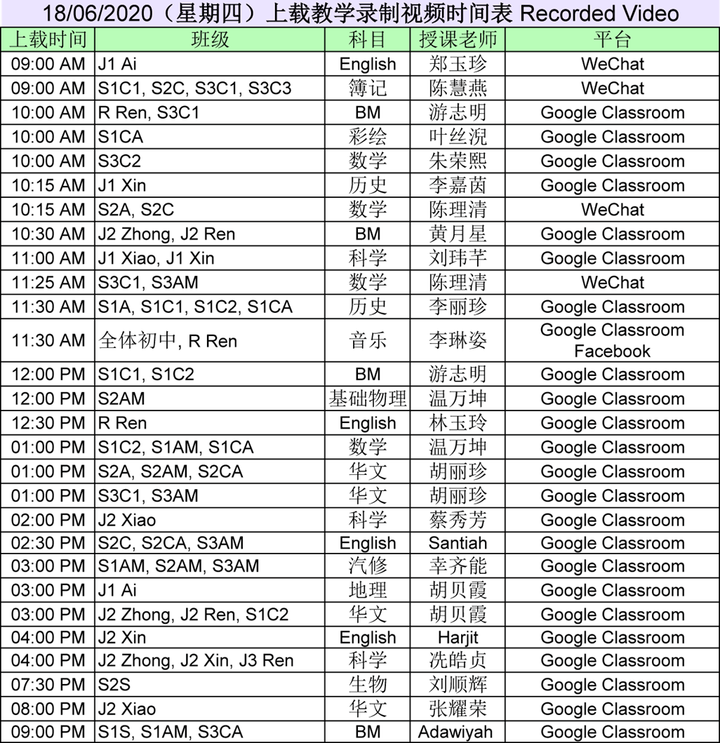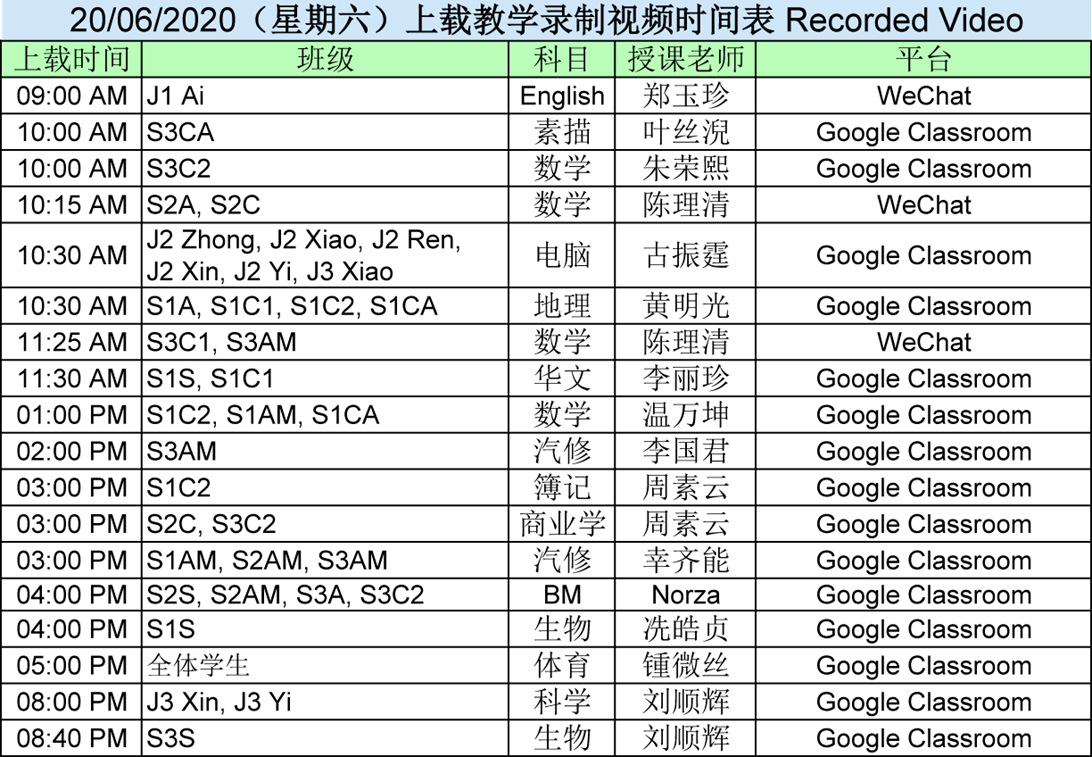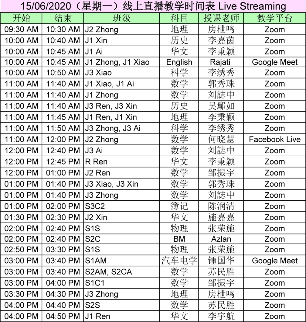 【15.06.2020~21.06.2020】“线上直播教学” 和 “上载教学录制视频” 时间表