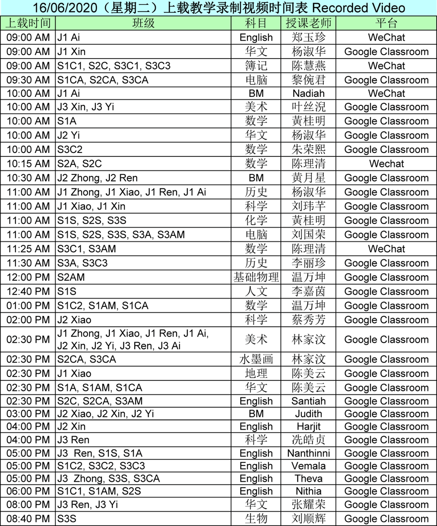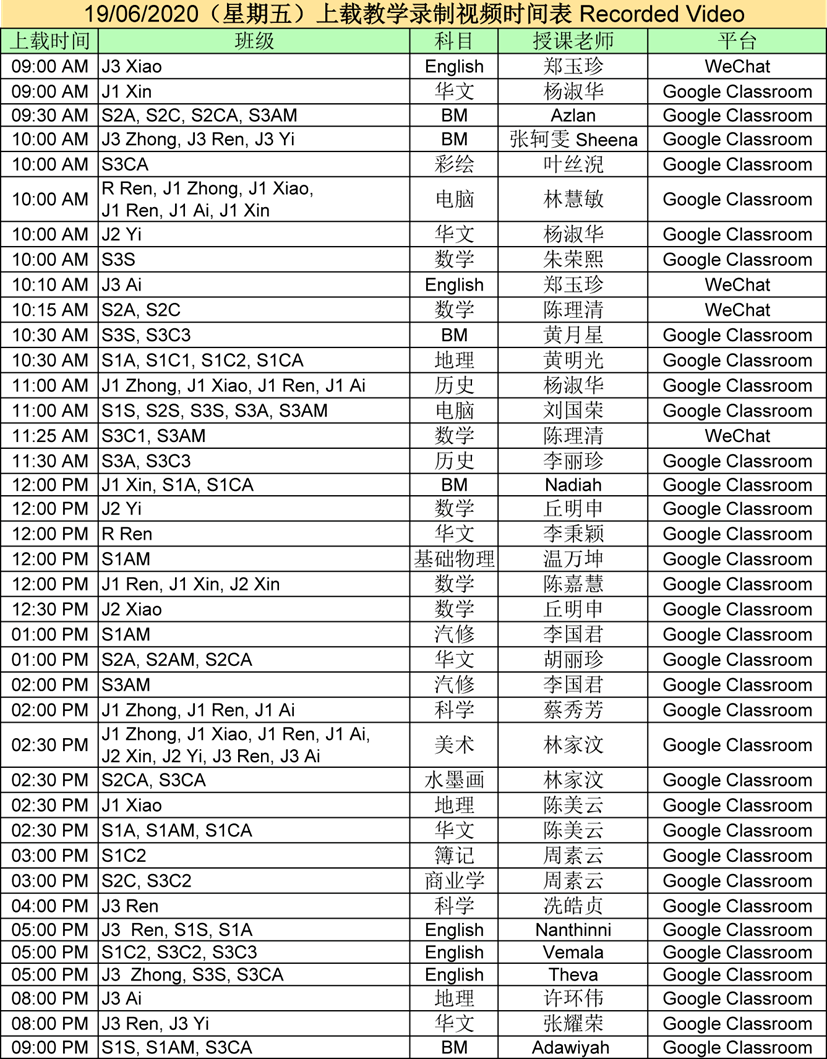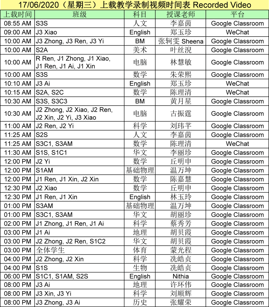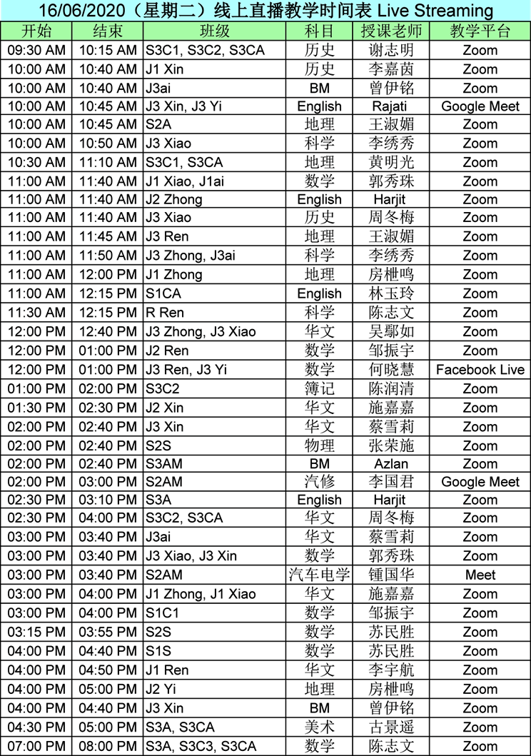 【15.06.2020~21.06.2020】“线上直播教学” 和 “上载教学录制视频” 时间表