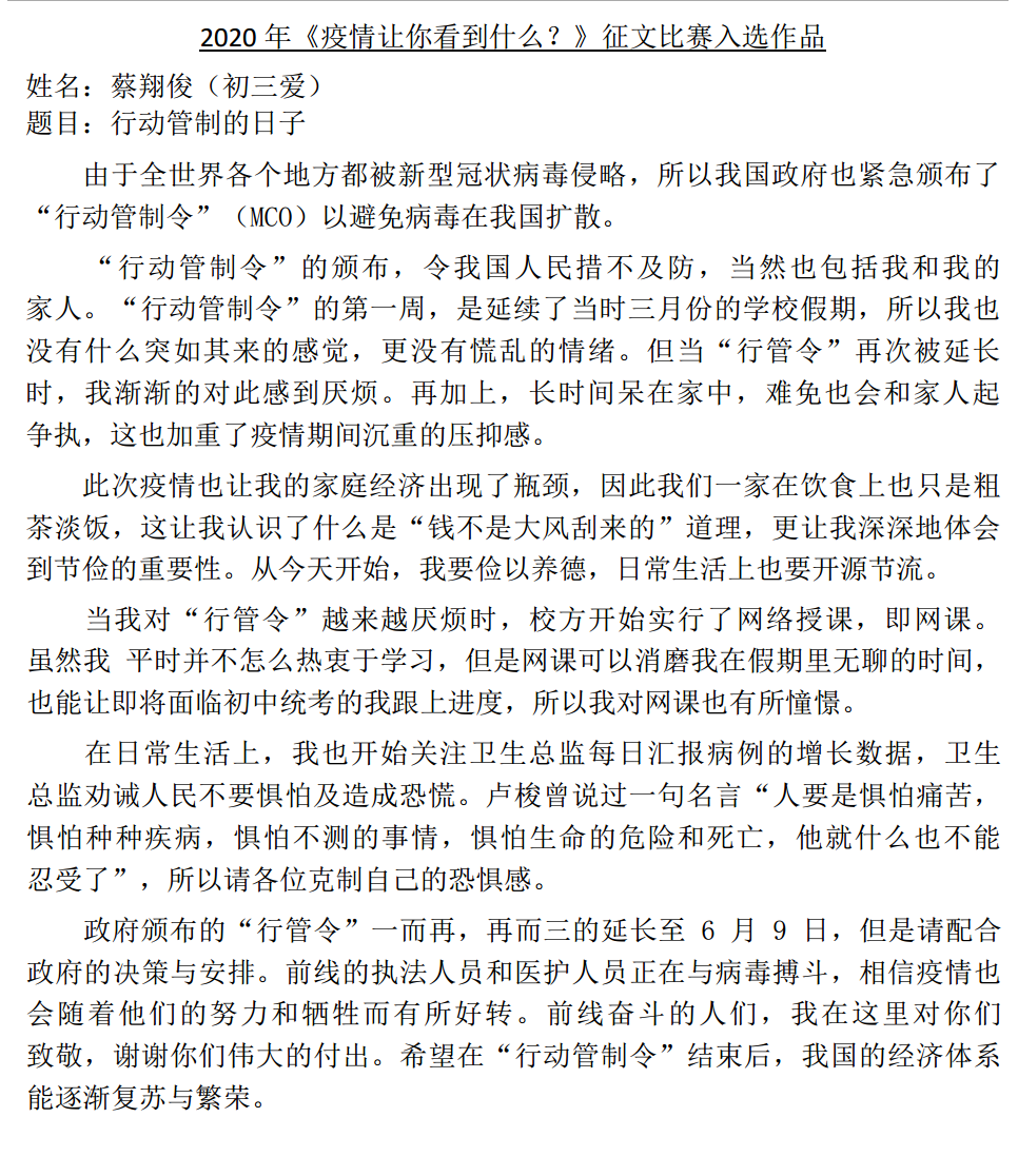 《疫情让你看见什么?》征文比赛成绩揭晓(29/05/2020 附上入选作品6,7)