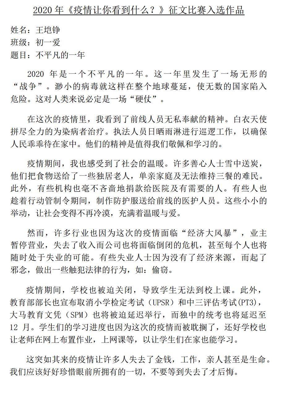 《疫情让你看见什么?》征文比赛入选作品(6,7) 2020年5月29日发布 在漫长的抗疫过程里,本校宣教处举办的《疫情让你看见什么?》征文比赛,获得了同学们热烈的反应,感谢同学们的参与。 【备注:入选作品將于一星期内陆续公布,敬请关注,谢谢。】 今天 29/05/2020 公布的作品,是来自初三孝的高文谏同学、高三理的方翊诠同学。 » 点击浏览 27/05/2020 公布的作品:来自初一爱的覃星珲同学、高二理的高婕丝同学 » 点击浏览 28/05/2020 公布的作品:来自初二孝的吴泓欣同学、初三孝的杨曲星同学、高一商一的廖雪晶同学 .入选作品的名单如下: