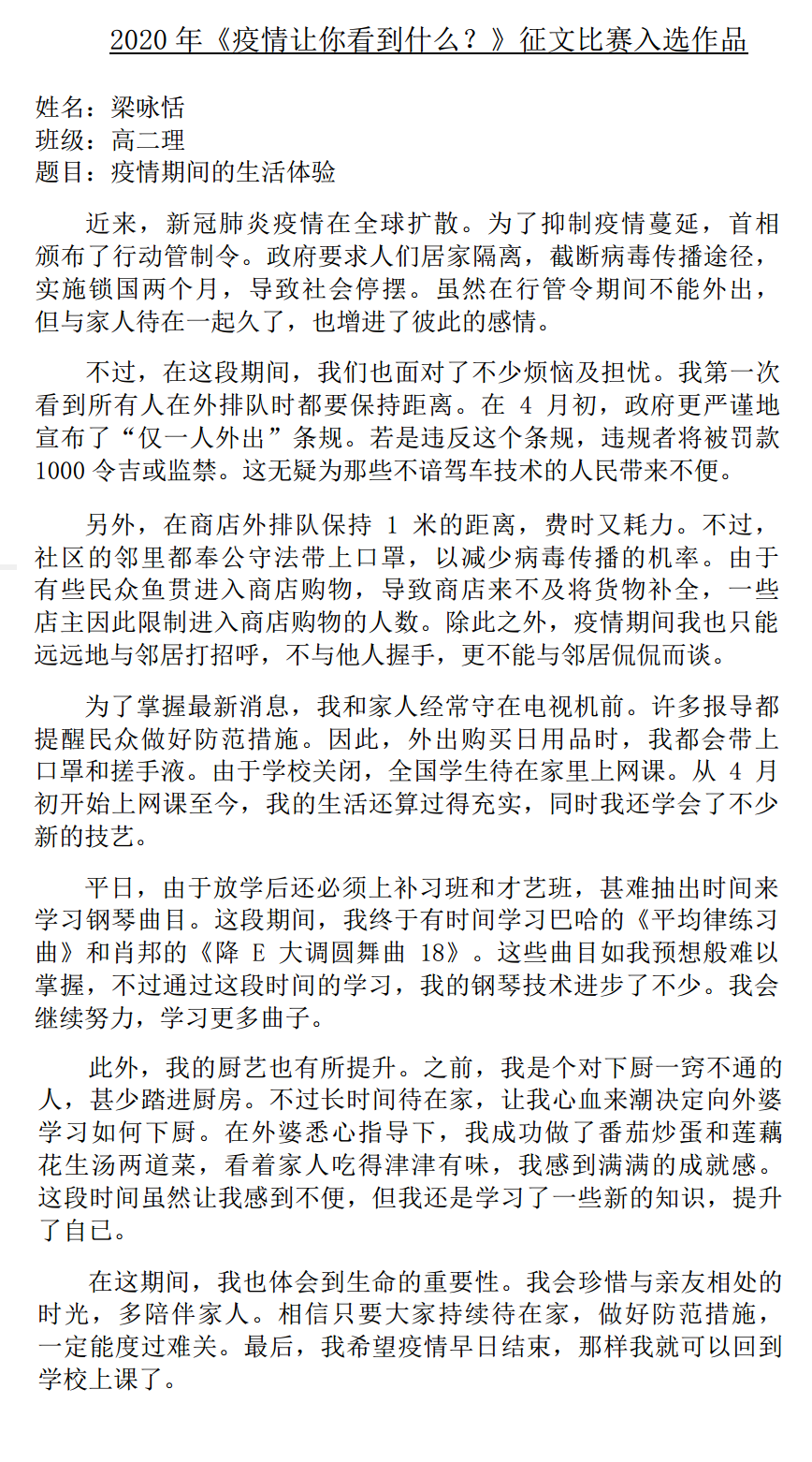 《疫情让你看见什么?》征文比赛入选作品(8,9) 2020年5月30日发布 在漫长的抗疫过程里,本校宣教处举办的《疫情让你看见什么?》征文比赛,获得了同学们热烈的反应,感谢同学们的参与。 【备注:入选作品將于一星期内陆续公布,敬请关注,谢谢。】 今天 30/05/2020 公布的作品,是来自初一爱的王垲铮同学、高二理的梁咏恬同学。 » 点击浏览 27/05/2020 公布的作品:来自初一爱的覃星珲同学、高二理的高婕丝同学 » 点击浏览 28/05/2020 公布的作品:来自初二孝的吴泓欣同学、初三孝的杨曲星同学、高一商一的廖雪晶同学 » 点击浏览 29/05/2020 公布的作品:来自初三孝的高文谏同学、高三理的方翊诠同学 .入选作品的名单如下: