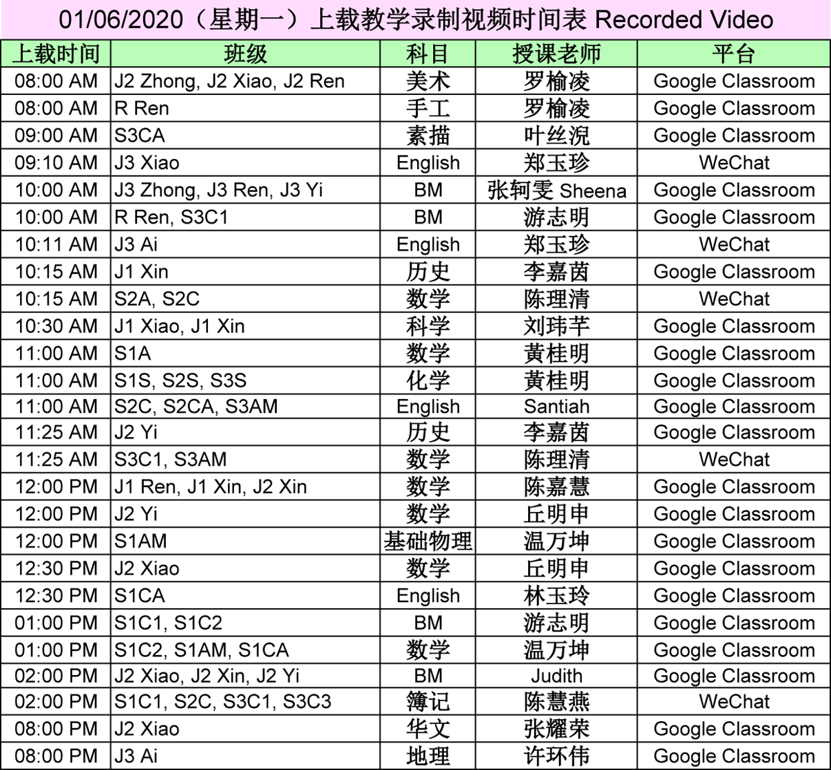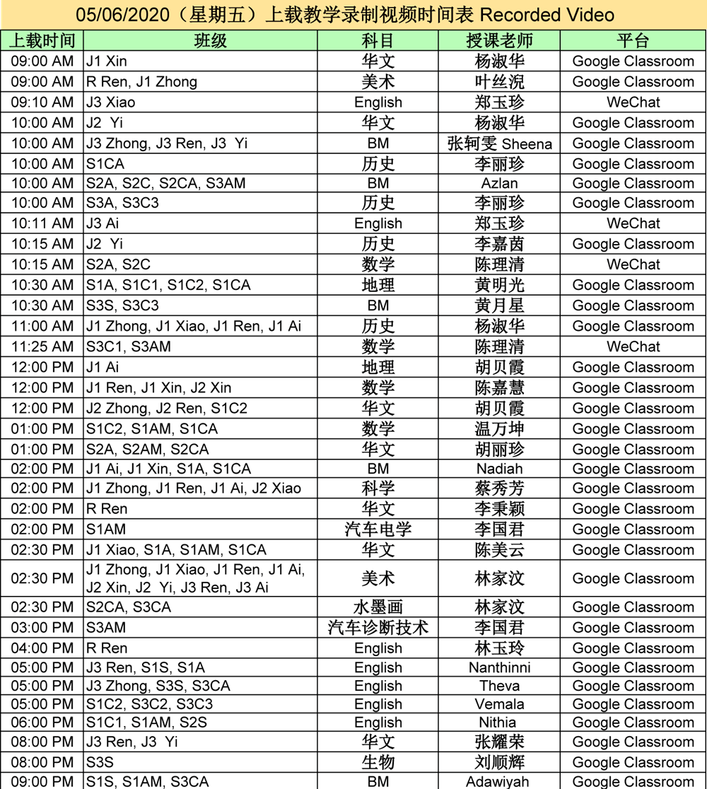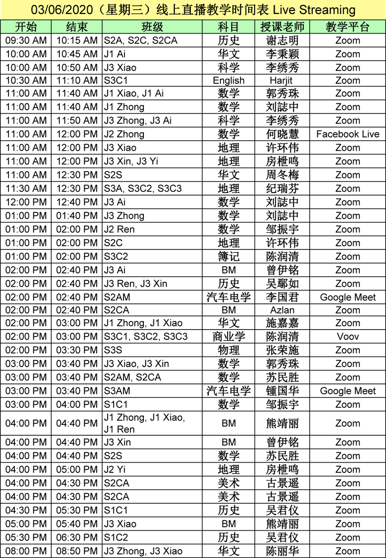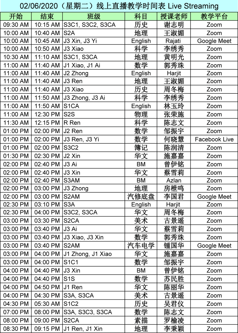 【01.06.2020~07.06.2020】“线上直播教学” 和 “上载教学录制视频” 时间表