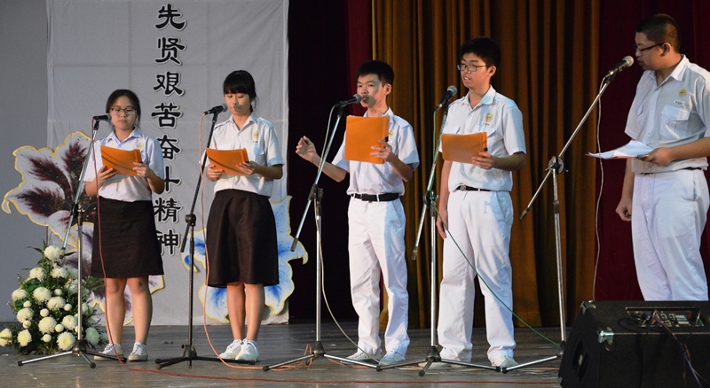 大会主席本校黄亚珠董事长致词。 . 他回顾了我国华文教育近100年内所经历的艰苦路程,也要求希盟政府修改压制民族教育发展,不符合国情、不利于各民族团结的法令、政策与措施。他促请希盟政府排除万难,全力为我国构建一个多元团结、公平合理对待各民族教育的新社会。 他说,我国华教事业已经有近200百年的历史,在不同的时期,不同的地区,可以发现有无数点燃民族教育火把的先辈。有的人形象伟岸,面目清晰,还有无数默默耕耘的无名英雄,人们可以看到他们的身影,为维护和建设华教,不辞劳苦地奔波,尽心尽力。华教事业就是由这些千千万万热爱华教的群众所发起、推动和坚守的。 马来西亚维护华教联合会主席叶新田博士致词时说,华教先贤日自2011年开始第一次举办,目的在于纪念马来西亚自有华文教育以来,所有为华教开荒播种,捍卫华教生根发芽以至茁壮成长,而奉献了力量的众多先行者,以及在华教经受风雨吹袭,挺身而出捍卫华教生存和发展的人士。他们对华教的奉献和付出,永远值得华教事业的追随者们缅怀、敬仰和学习。 马来西亚维护华教联合会主席叶新田博士致词。 . 他补充,举办这个富有意义的节日,目的还在于鼓舞当前的华教工作者和广大爱护多元教育和文化的社会人士,以先辈为榜样,不管世事风云如何变幻,始终把多元团结、教育公平的旗帜坚持下去,让马来西亚成为一个多元团结的国度,实现各源流教育公平、各民族权利平等的社会。 他说,近200年来,华教运动人才辈出,华社先辈努力弘扬中华文化,维护和发展华文教育,抗拒当局打压。早在19世纪,我们的先辈漂洋过海南来,他们不仅开荒辟野,发展这片土地,同时也在各地开办华校,薪火相传,弘扬中华文化,使华教得以在本地区承传。 他希望我国的华文教育能获得改善,包括检讨《2013–2025年教育发展大蓝图》内不利于母语教育的政策与措施,对统考文凭的承认,以及对华小、独中的扶持,对华社民间大专院校的资助,在多元团结的开明政策下,让华教拥有更大的发展空间。他强调,华教组织不只要存在,更应扩大和巩固,而华教工作者也必须认清在新形势下的历史任务,既要看到和争取华教的美好远景,也要脚踏实地,做好当前工作。 本校学生朗诵诗歌致敬华教先贤。 本校邀请国会议员黄家和主讲《议会民主》