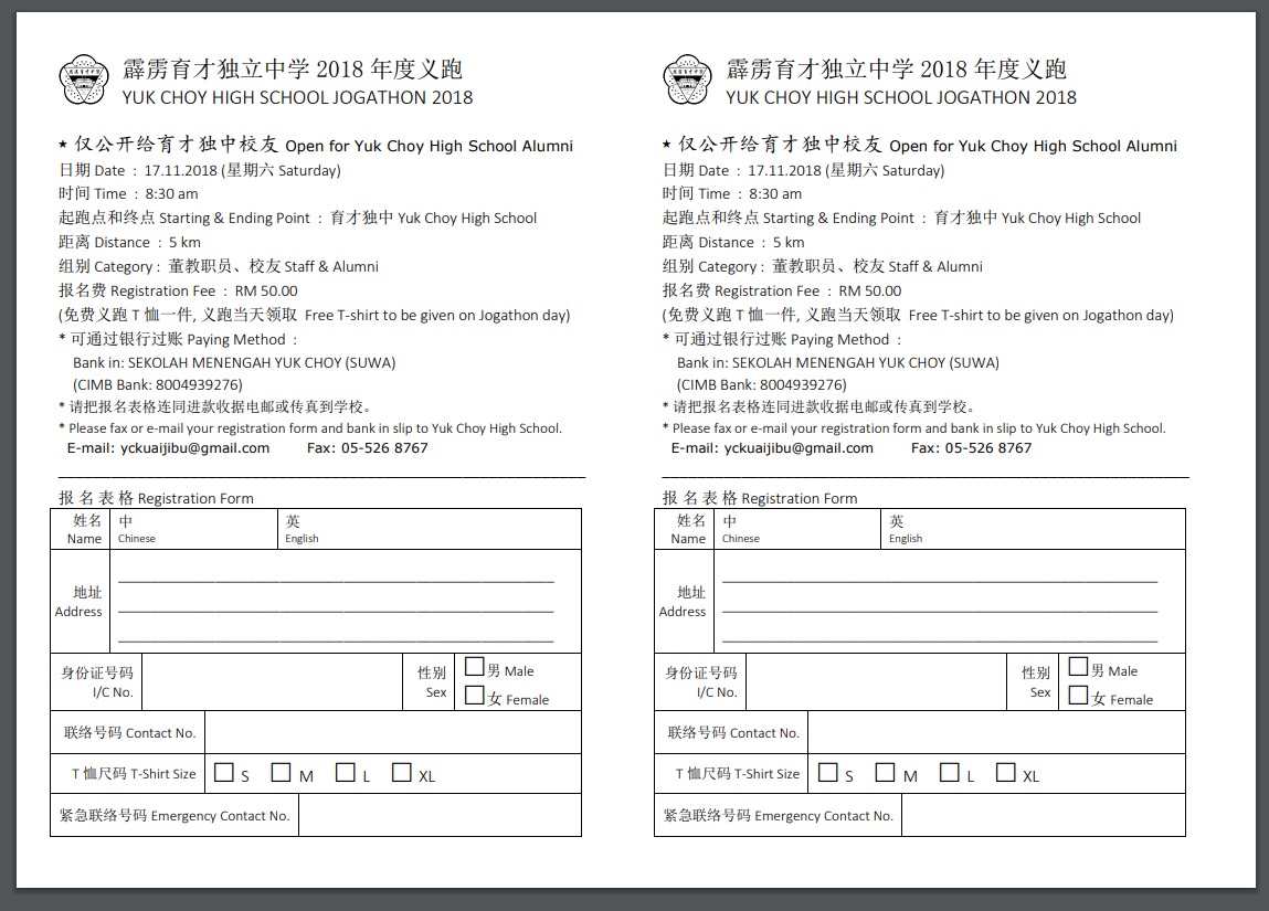 本校义跑活动2018年11月17日举行 欢迎校友踊跃参与 本校一年一度的义跑活动即将于2018年11月17日(星期六)举行,也特别公开给本校校友参与,让校友们能够利用这个机会重返母校,再度回忆当年在义跑的路上挥洒汗水的日子。 以下是公开给校友参与的2018年义跑活动详情: 日期:2018年11月17日(星期六) 时间:上午8时30分 起跑点和终点:育才独中 距离:5公里 组别:董教职员、校友 报名费:RM 50.00(附送2018年义跑T恤一件) 【点击链接下载报名表格】http://www.yukchoy.edu.my/download/YCHS-Jogathon2018.pdf 【点击链接下载路线图】http://www.yukchoy.edu.my/download/YCHS-Jogathon2018-Route.pdf 芙蓉中华中学拜访本校