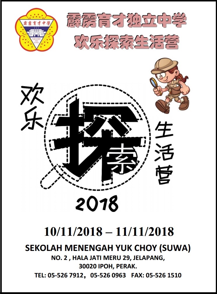 育才独中11月10日及11日举办“欢乐探索生活营” 考试季节结束,孩子们在等待年终假期的当儿无所事事?那就赶紧报名参加育才独中主办的“欢乐探索生活营”,让有趣的语文、手工和科学知识陪伴孩子们欢乐度过一个周末。 “欢乐探索生活营”将于2018年11月10及11日(周六和周日)在本校位于九洞的校园举行,为期2天1夜。这项生活营公开给华小五年级和六年级的学生参加,报名费为150令吉,包含了T恤、膳食、住宿、文具、环保袋、手工艺品材料、保险费等费用。 生活营将结合多项富有趣味性的活动,如数理科相关的迷宫游戏和科学实验、美术科相关的手工艺品和立体造型制作、语文科相关的闯关活动、康乐活动等等,内容充实和多姿多彩。 生活营将在11月10日上午8时半至9时报到后开始,11月11日中午12时结束。报名截止日期是10月26日,欲知详情,可致电05 – 526 0963联络本校教务处副主任许环伟老师。