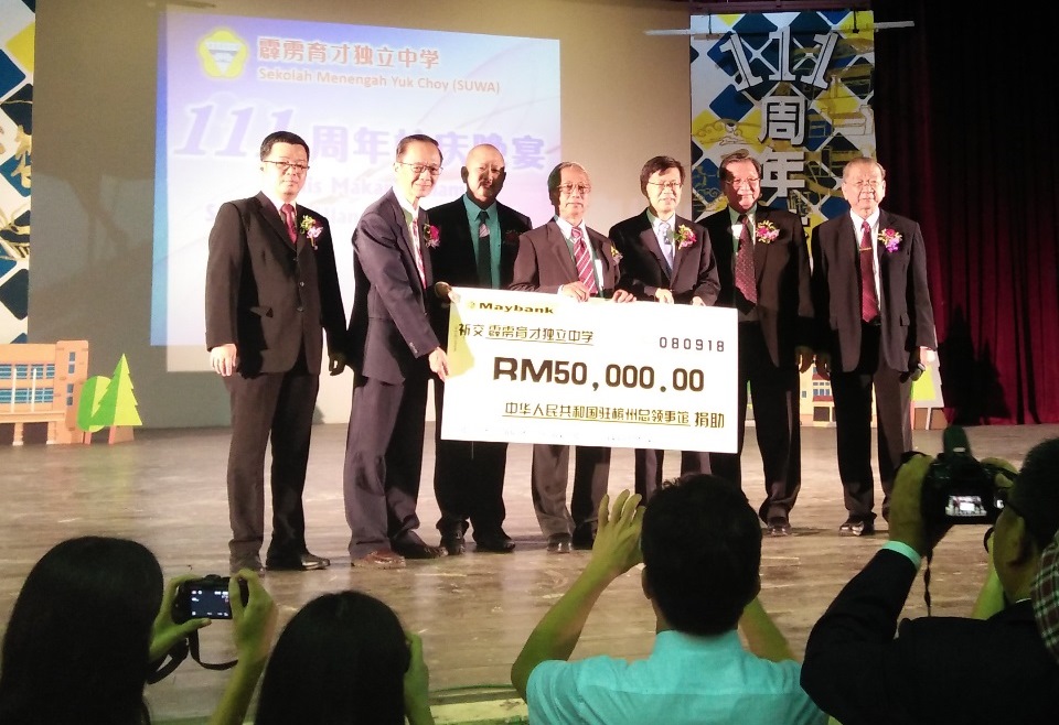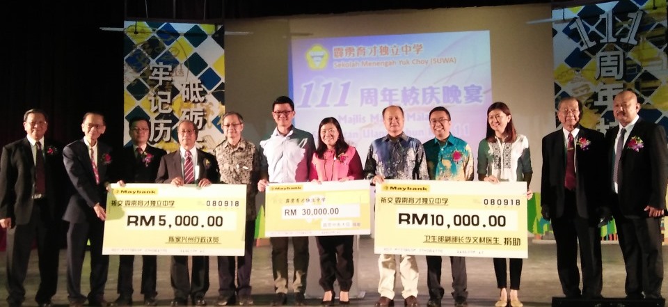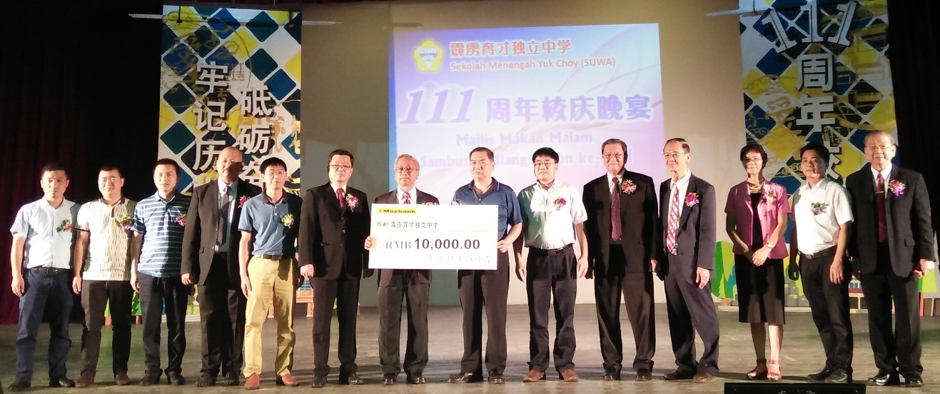 本校于2018年9月8日(星期六)在杨金殿礼堂举行“111周年校庆”晚宴,筹募提升李莱生图书馆及装修宿舍基金,获得各界热心人士踊跃支持,非常热闹,剪彩、亮灯、鸣鼓和鸣锣嘉宾人数众多。 当晚代表霹雳州务大臣阿末法依沙出席的霹雳州行政议员黄渼沄宣布,大臣捐出3万令吉予本校,她和另一位出席的霹雳州行政议员陈家兴,各捐献5000令吉。 其他出席嘉宾卫生部副部长李文材医生捐献1万令吉,九洞州议员谢保恒捐献1万令吉。另外,中国驻槟城总领事鲁世巍代表中国驻槟城总领馆捐献5万令吉予本校设立 “育才赴华励学金”,而中国广东省平远县平远中学则捐献人民币1万元予本校。 本校学生也呈献各种节目,如管乐演奏、武术表演、合唱、二十四节令鼓表演、舞蹈表演、华乐演奏,以及刘于恩同学演唱歌曲。 卫生部副部长李文材医生(左五起)、霹雳州行政议员陈家兴、林渼沄、九洞州议员谢保恒移交捐款。 左起署理董事长拿督吴国芳、董事会财政黄伟生、苏民胜校长、董事长黄亚珠; 右起校庆晚宴工委会主席拿督高利发、董事会总务王瑞国博士、迪渣州议员黄诗情、丹绒马林国会议员郑立慷。 . 中国驻槟城总领事鲁世巍(右三)代表中国驻槟城总领馆捐献5万令吉予本校设立 “育才赴华励学金”。 . 平远中学捐献人民币1万元予本校。 黎锦华汽车维修实习厂开幕典礼