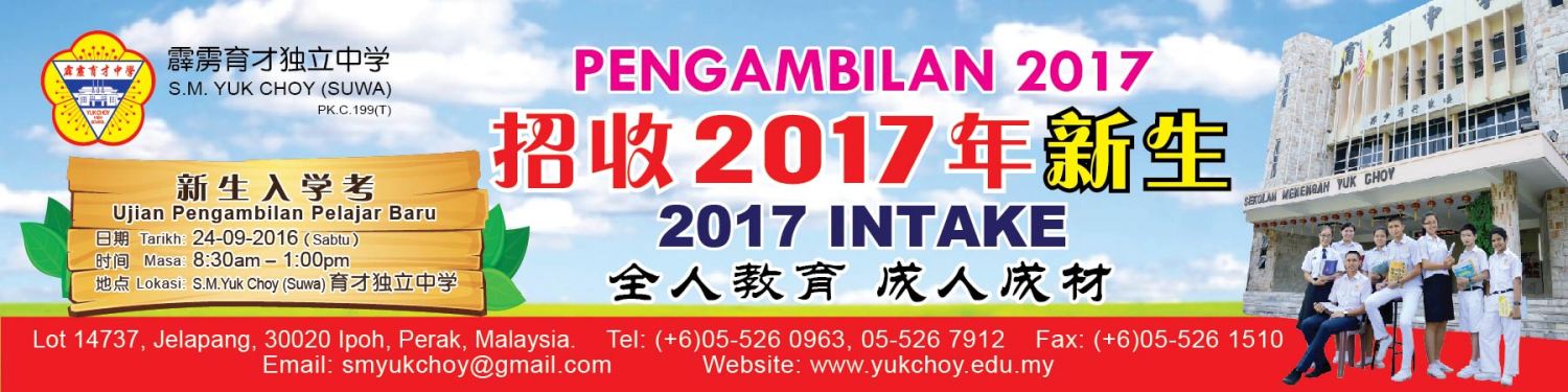 除了传统班级外,本校也有美术设计班和汽车维修班供学生选择就读。 . 他补充,为了安顿来自外地的学生,本校也设有男女生宿舍。宿舍内设备齐全,有阅览室、图书室、茶艺室、会议室、健身室、电脑室等学习和休闲设施,为寄宿生打造一个舒适的寄宿环境,校方也聘用多名全职生活导师给予同学生活上和课业上的辅导。 他说,所有报名的新生都必须参加新生入学编班考试,本校将于9月24日(星期六)为新生安排这项考试,考试科目包括华文、国文、英文和数学。录取名单将在考试后一周内公布在主要华文报章和学校网站www.yukchoy.edu.my。 . 9月假期办“小牛顿生活营” 另外,本校也将在9月10日和11日(星期六和星期日)举办为期2天1夜的“小牛顿生活营”。这项活动公开给小学5年级和6年级的学生参加,活动内容包括制作手工肥皂、高丽菜变色实验、海马吸管手工、趣味实验示范、水火箭制作、康乐活动等等。这项活动报名费为150令吉,包含一件T恤、早午晚餐、夜宵和文具。 苏民胜校长也说,基于教室空间有限,本校明年只招收200名新生,他吁请有意为孩子报读育才独中的家长趁早报名参加入学考。家长也可亲临本校教务处询问和办理报名手续。 本校的办公时间是星期一至星期五,由上午8时30分至下午3时30分,星期六由上午8时30分至中午12时30分,任何询问可联络育才独中教务处,电话:05 – 526 7912,05 – 526 0963;传真:05 – 526 1510。